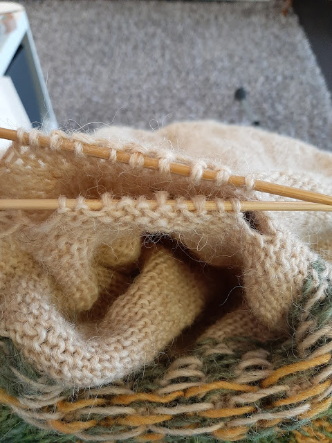 Olen niin tyytyväinen itseeni, kun maltoin opiskella kolmen puikon päättelyn kainaloihin. Tällä kertaa vältyin parsimasta reikiä, jotka puikon päihin syntyy. Poimin tuolta puikkojen välistä vielä silmukoita ja neuloin ne kiertäen yhteen.