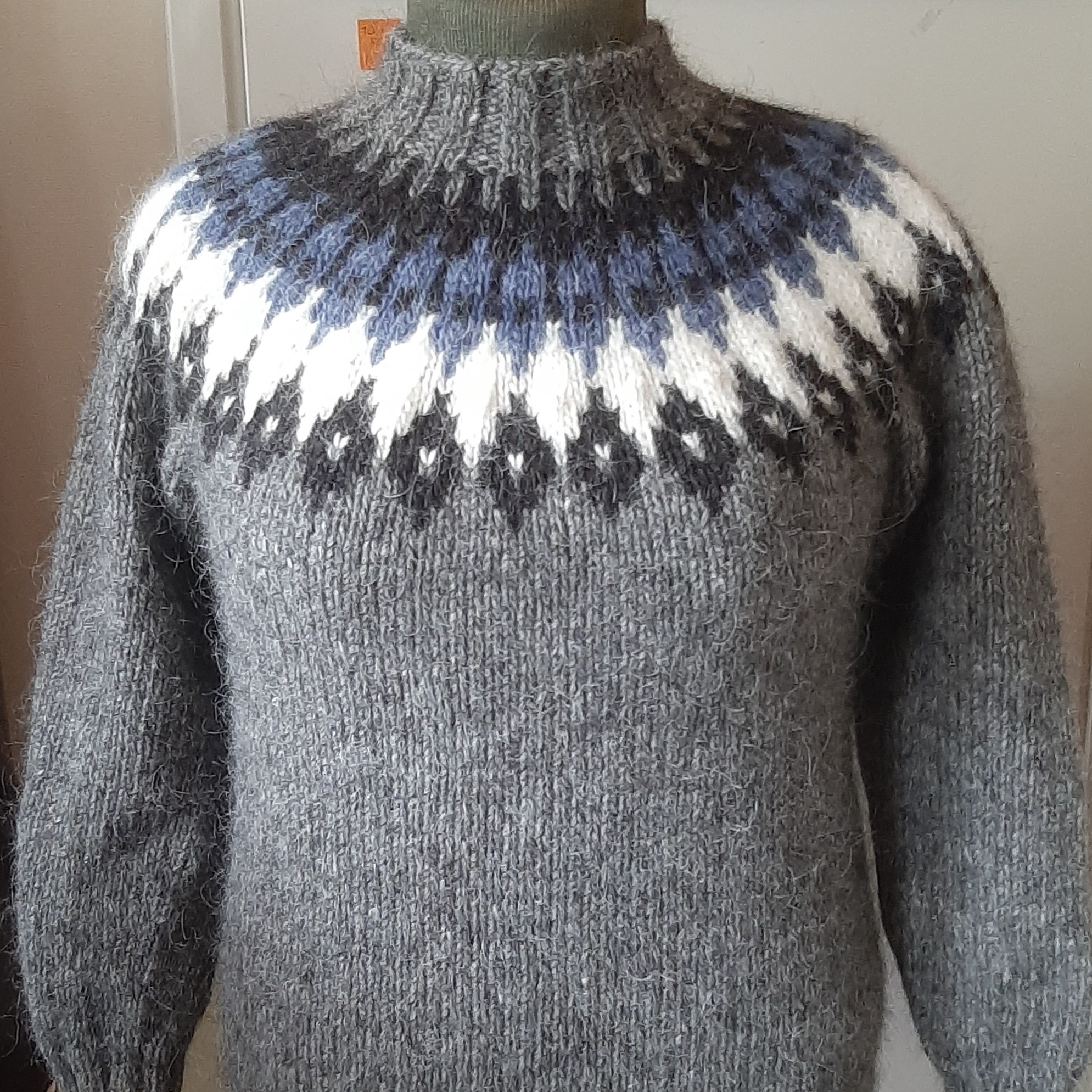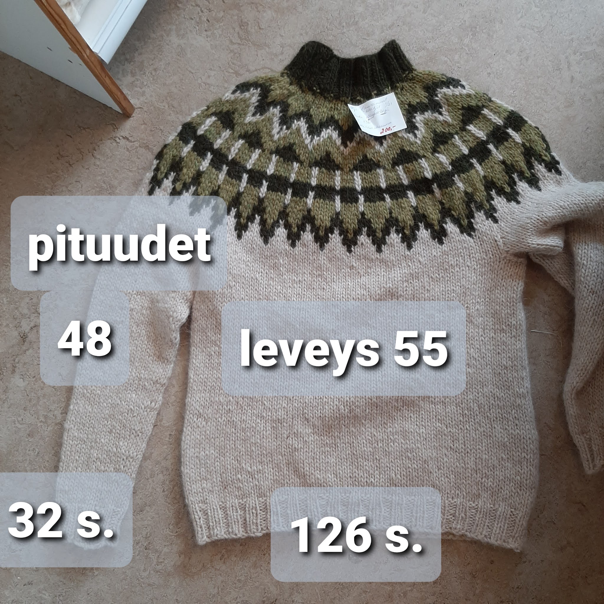 Kaksi viikkoa sitten perjantaina sain islantilaisen neuleen tilaustyön. Asiakas (mies) valitsi mallin ja värit Alafosslopista. Koko määrittyi valmiin puseron mukaan, jonka olin tehnyt samasta langasta. Eli olisi pitänyt olla helppo – tehdä vaan samankokoinen. Otin matkalle mukaan kuvan, johon olin merkinnyt mitat, jotta minun ei tarvitsisi mallia kuskata mukana – mittanauha vain. Näin: