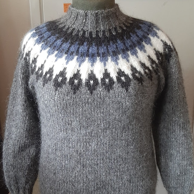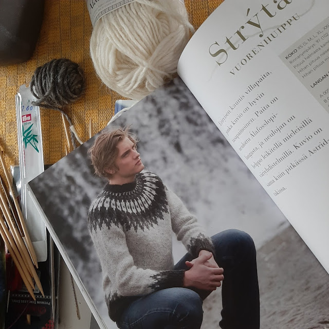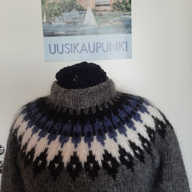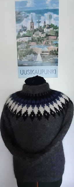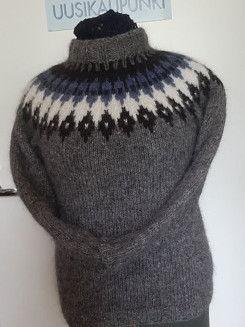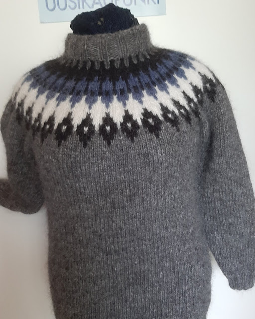 Tästäpä oikein kaunis pusero jollekin naiselle tai miehelle. Mallia olen muunnellut toivottujen värien mukaan, joten se ei ole aivan sama kuin kirjassa. Vyötärön ympärys tässä on 100 cm.