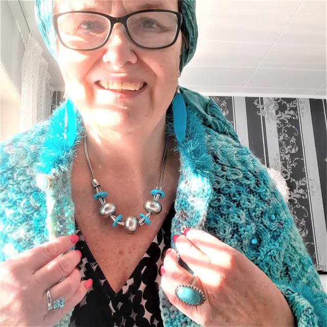 Takin kuvaamista varten etsin muutakin saman väristä ylleni ja löysinpä. Korut on samaa väriä ja hiuksiinkin löysin huivin.