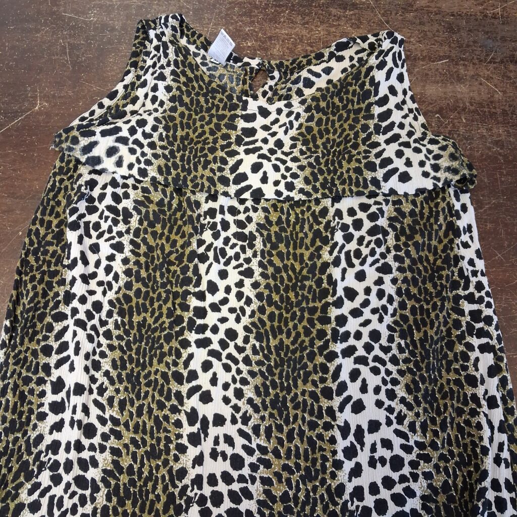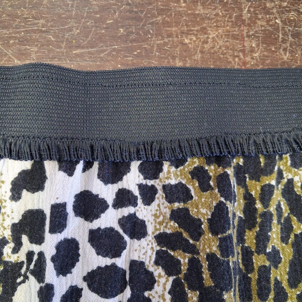 Sen pörröpuseron kyllä jo talvella neuloin, nyt puuttui vaan hame. Kierrätyskeskuksesta löysin leokuvioisen hihattoman tunikan. Hetken jouduin miettimään vaihtoehtoja, sillä tunika oli varsin käyttökelpoinen sellaisenaankin. Päätin kuitenkin katkaista sen hameeksi.