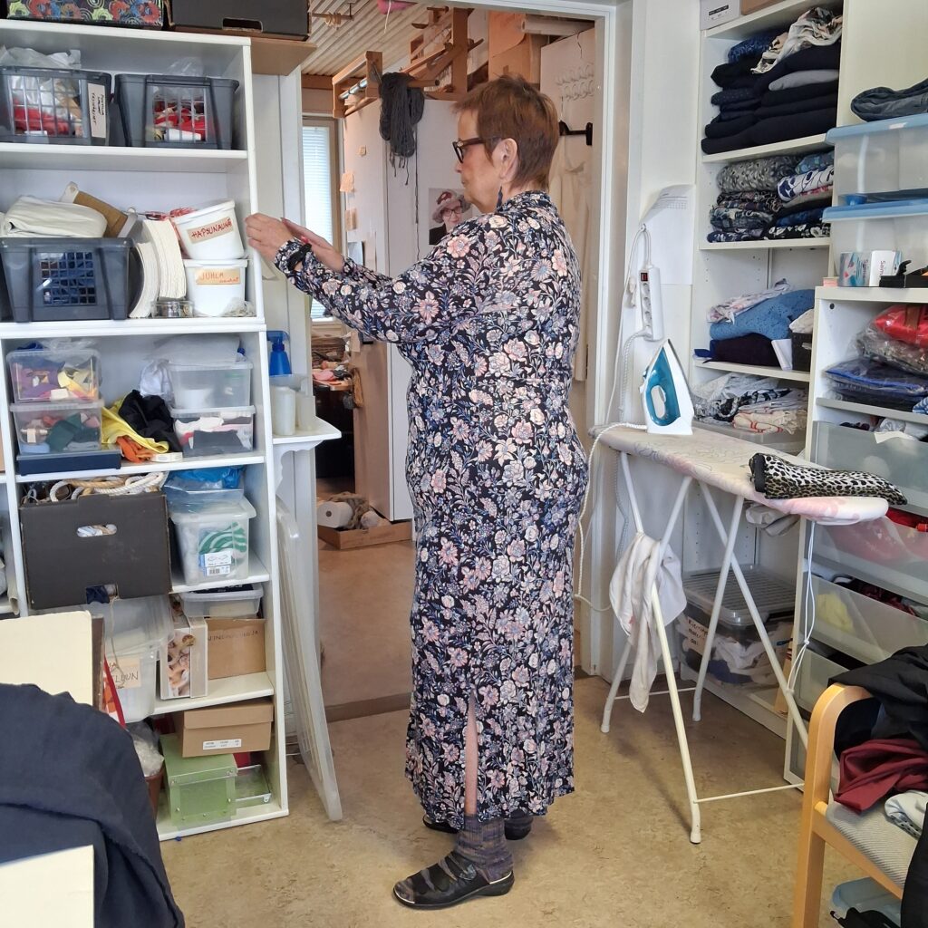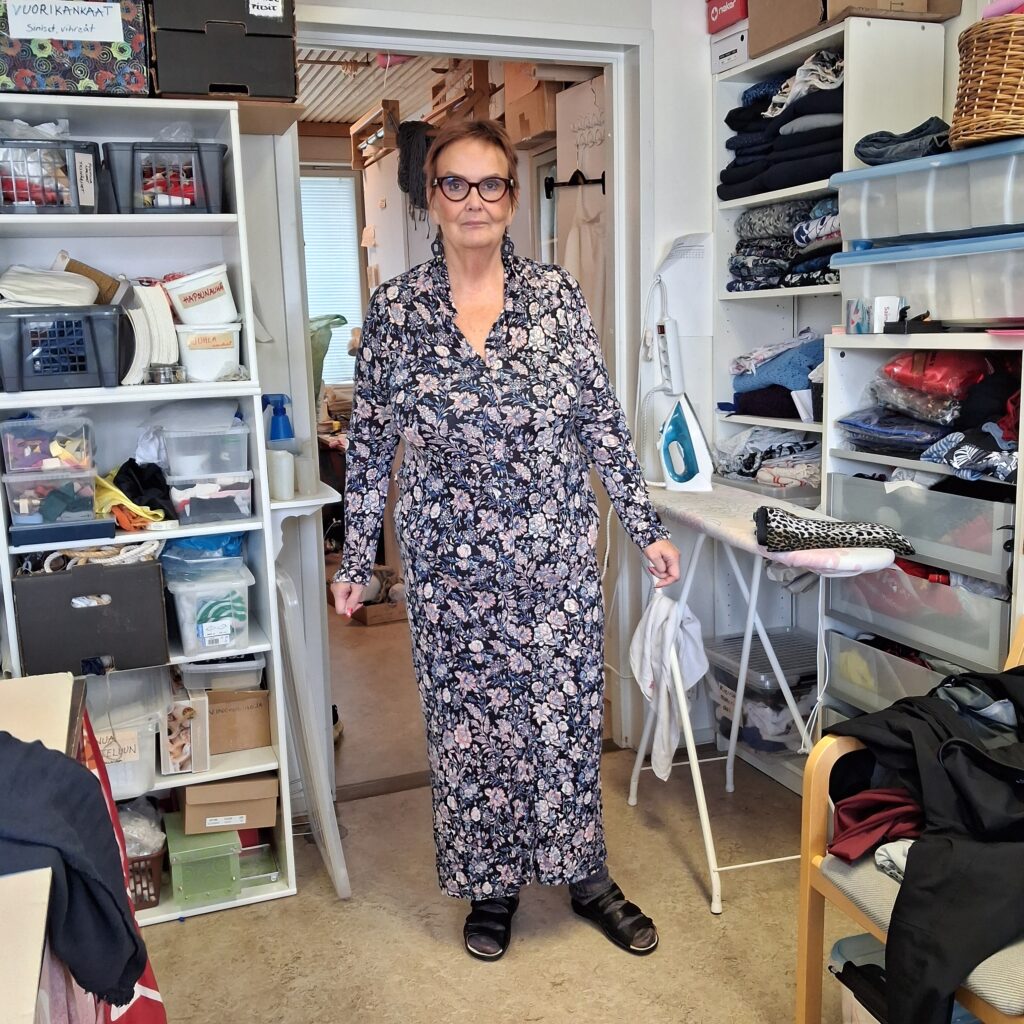 Jostain syystä ihastuin tähän kierrätyskeskuksen ilmaisosaston mekkoon. Ehkä väri, sininen ja vaaleanpunainen? Mekko on aivan liian pitkä ja aivan liian pieni. Hirvittävät kuvat työhuoneelta.