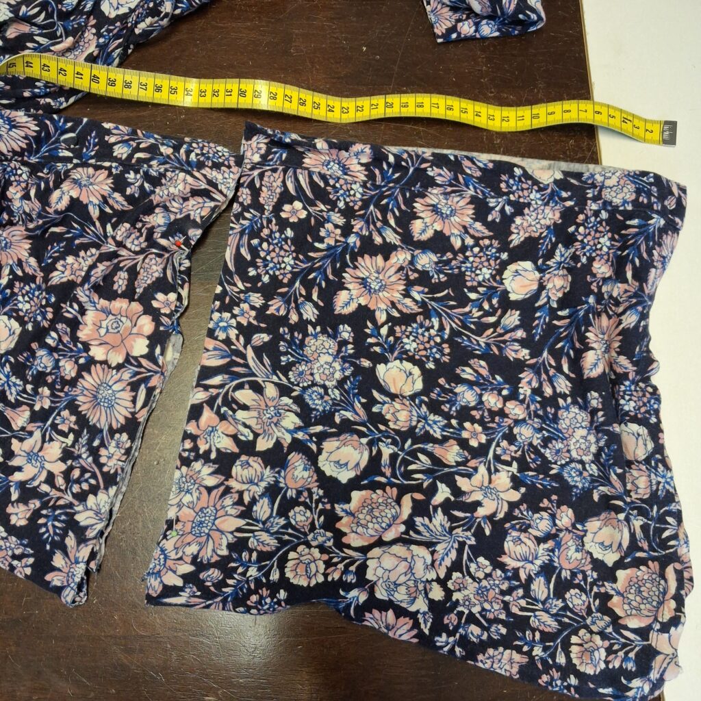 Aukaisin sivusaumat ja koska 30 cm ei riittänyt pituuteen, leikkasin jatkopalat toiseen suuntaan eli juuri niinkuin ei pitäisi. Langansuunta on jatkopalassa eri kuin mekossa. Trikoossa eikä kuviossa se haittaa ollenkaan! Kangas on niin kirjava, että jatkopalat häviävät näkymättömiin. Näin sain mekolle juuri ja juuri tarpeeksi tilaa, n. 15 cm pala kumpaankin sivuun. Etukappaleen nappilistan ompelin kiinni.