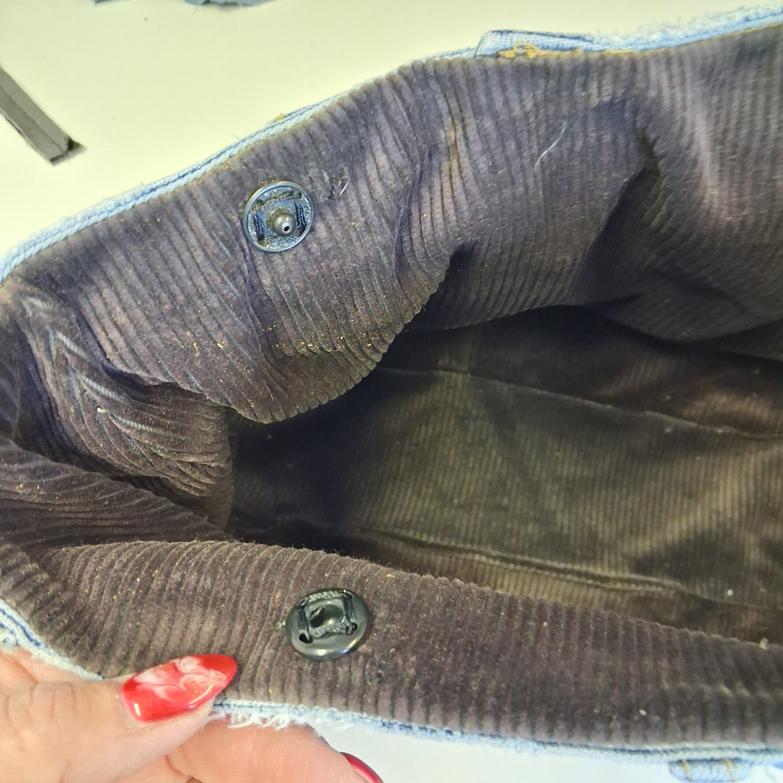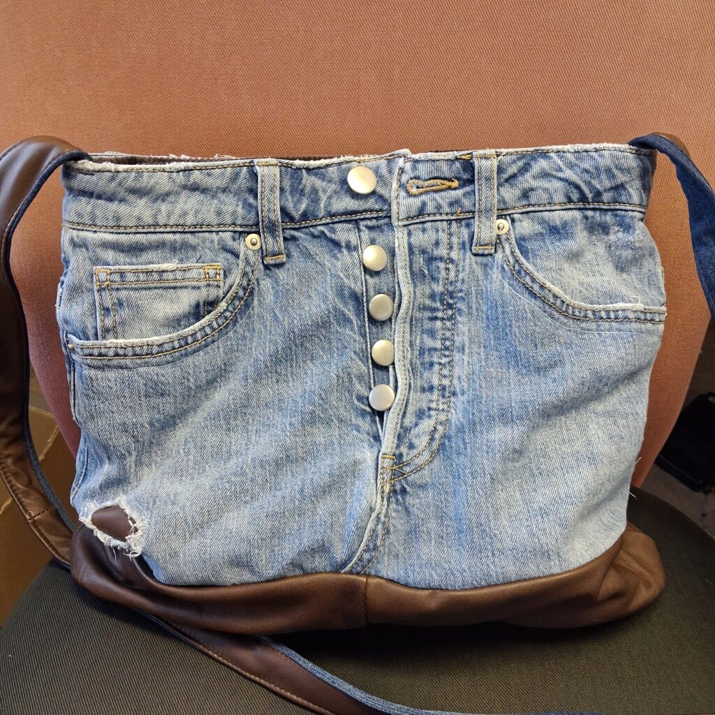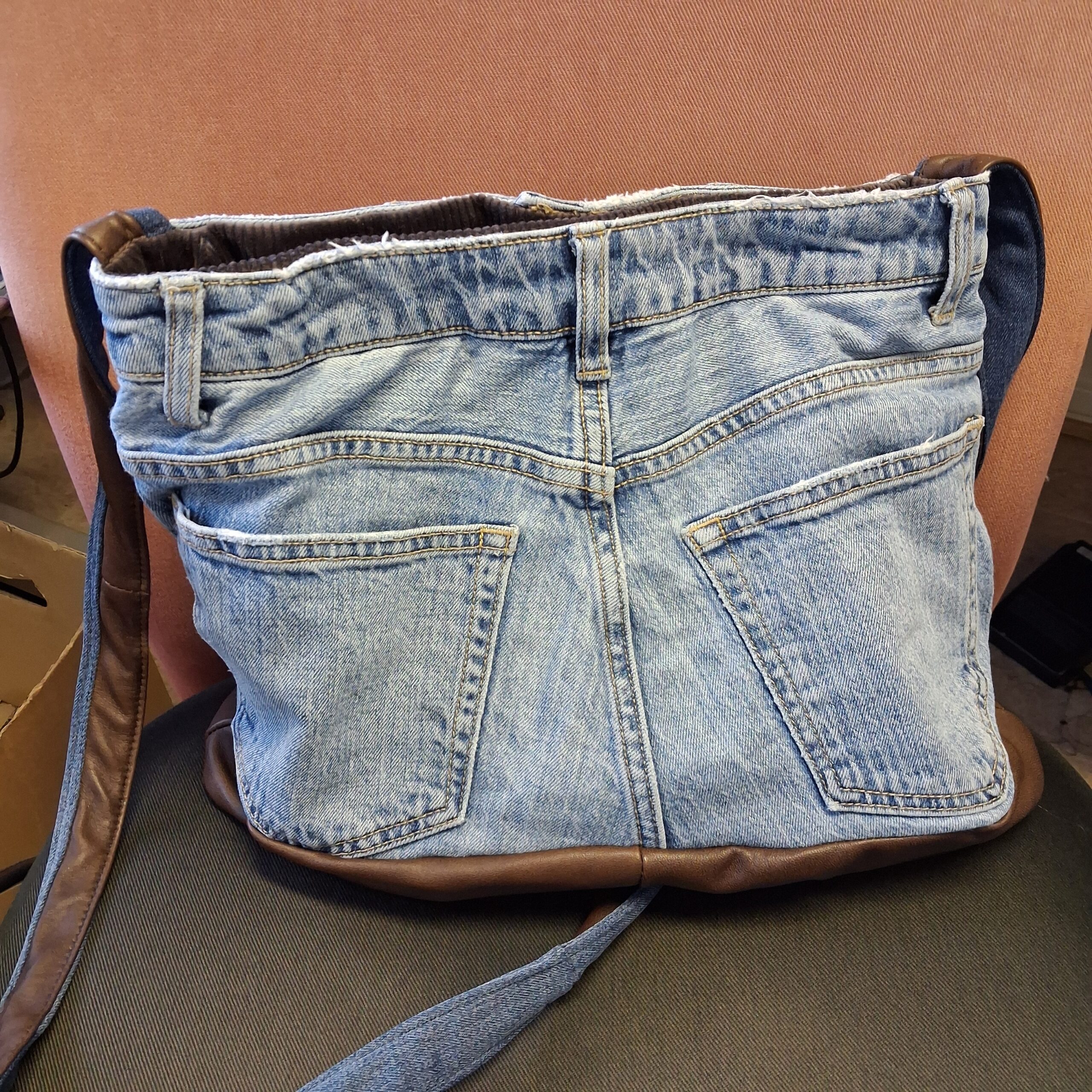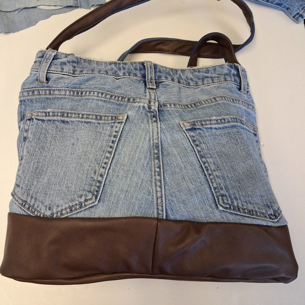 En voinut vastustaa tätä palasta, mikä jäi aiemmista farkkutilkkutöistä. Pieni vyötärökappale, jossa kiva nappilista. Siitä päätin tehdä laukun. Kappale näytti kuitenkin vähän liian matalalta, joten päätin lisätä sen alaosaan jotain ruskeaa. Vaikken muuten ruskeasta väristä itselläni pidäkään, sininen ja ruskea on aika kiva väripari. Ihan minun tyyliäni ei farkkukassi ole, mutta ”aika tavaran kaupitsee”, sanotaan.