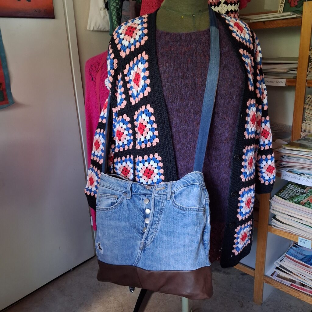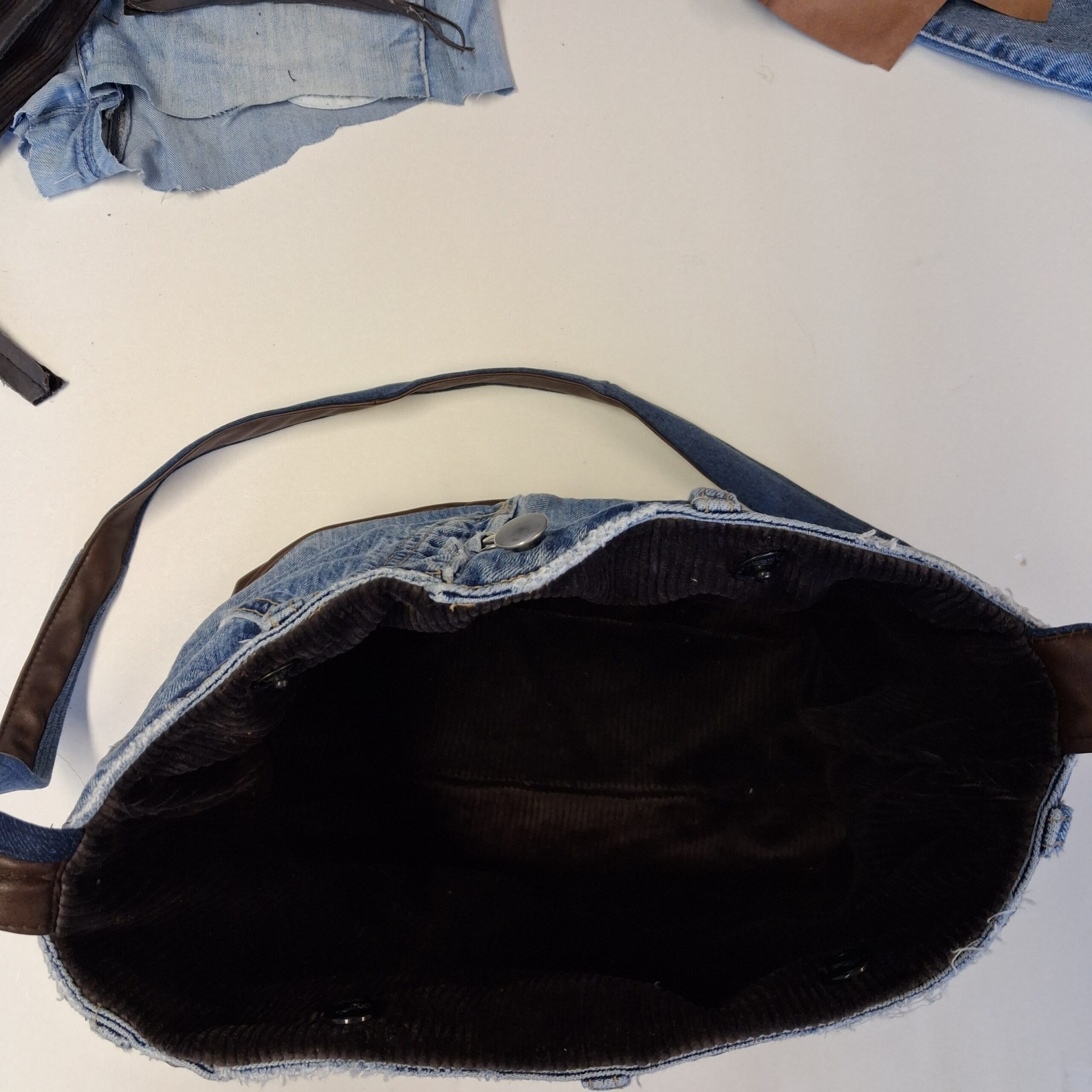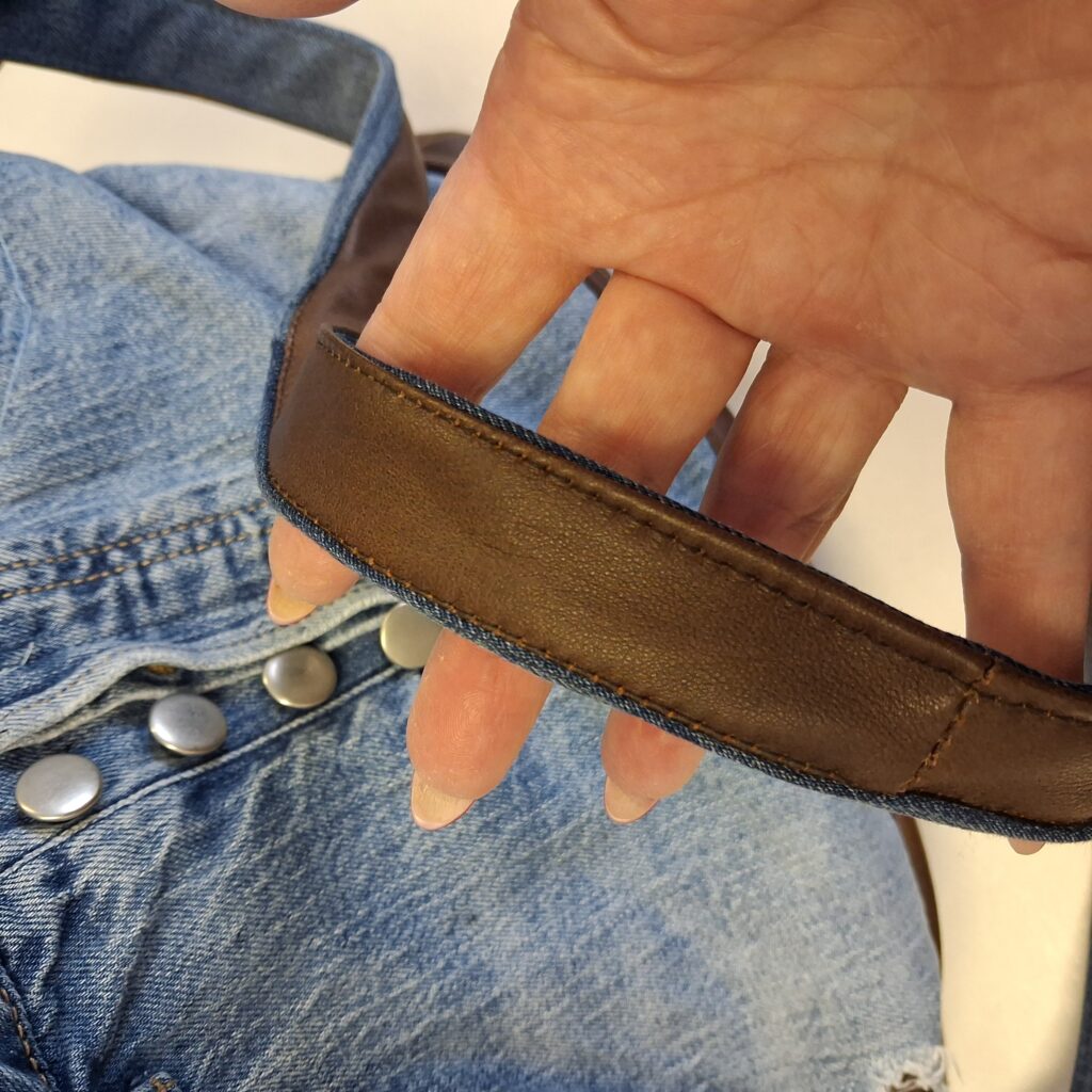 Olkahihnakin on ihan aloittelijan tekemän näköinen. Halusin siihenkin nahkaa ja farkkua. Jouduin molemmat puolet ompelemaan useammasta palasta. Kiinnitin hihnan vuorin ja päällisen väliin. Sen sentään huomasin etukäteen!