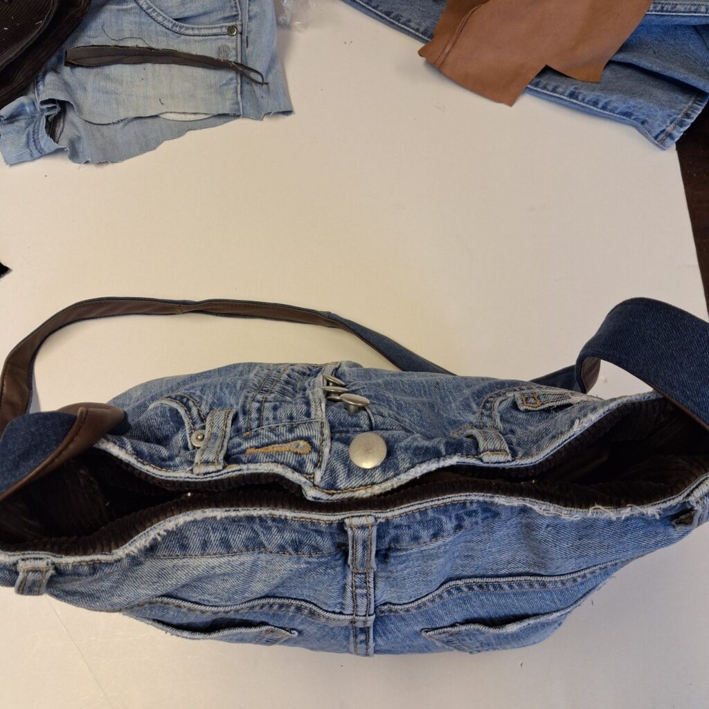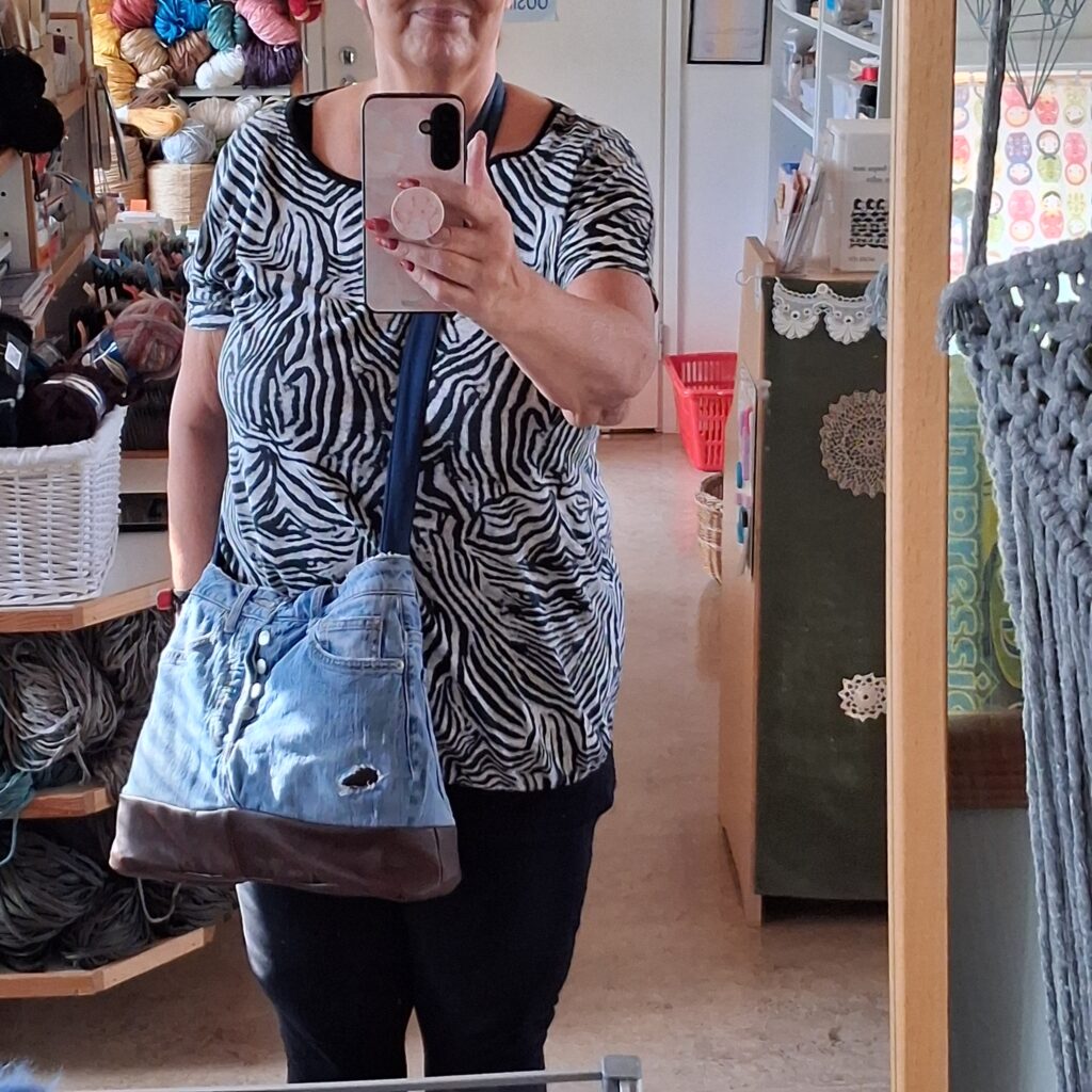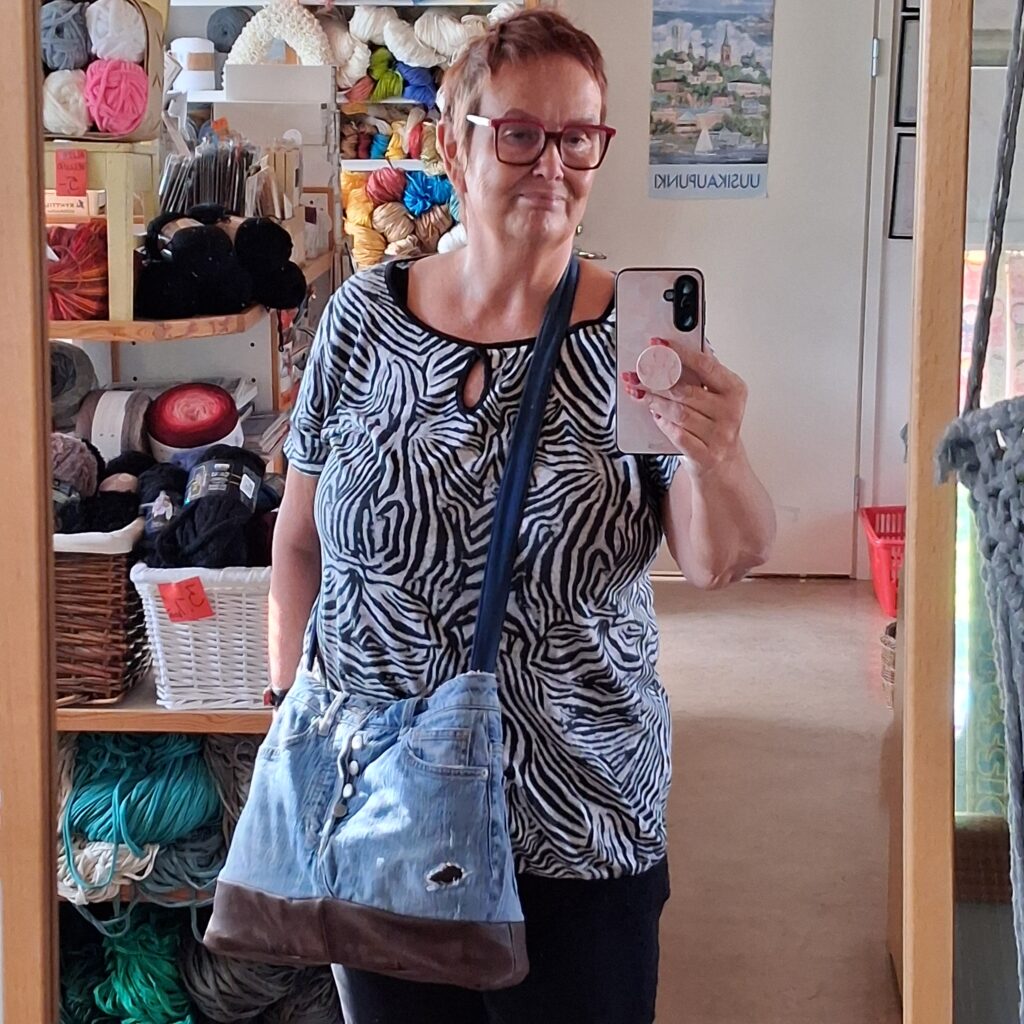 Olkahihnakin on ihan aloittelijan tekemän näköinen. Halusin siihenkin nahkaa ja farkkua. Jouduin molemmat puolet ompelemaan useammasta palasta. Kiinnitin hihnan vuorin ja päällisen väliin. Sen sentään huomasin etukäteen!