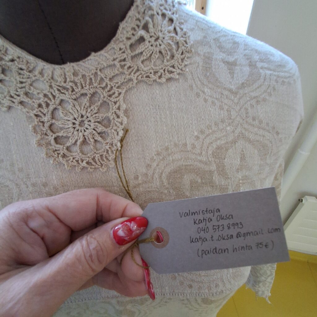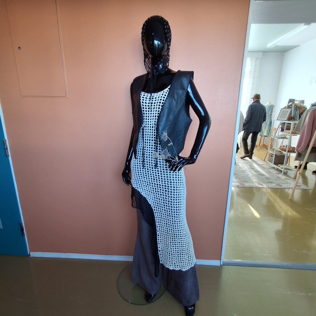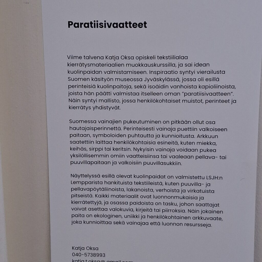 Ihan ensimmäisenä hätkähdyttivät Paratiisivaatteet. Katja Oksa on valmistanut nämä pitkät ”mekot” kierrätysmateriaaleista. Ne ovat siis kuolinpaitoja. Kauniita.
