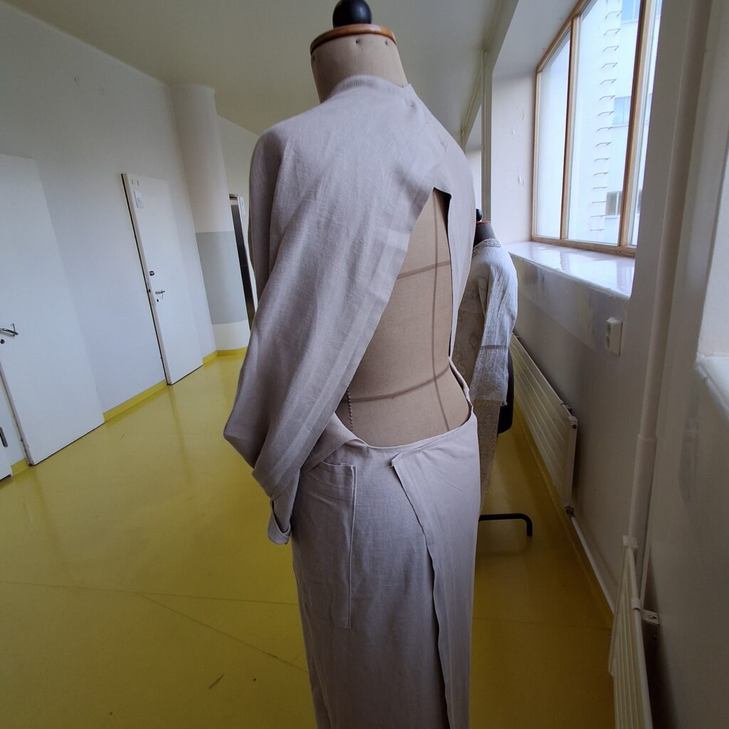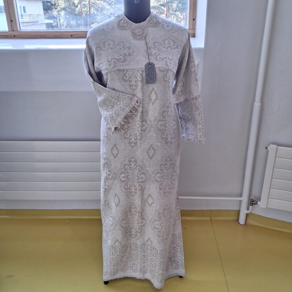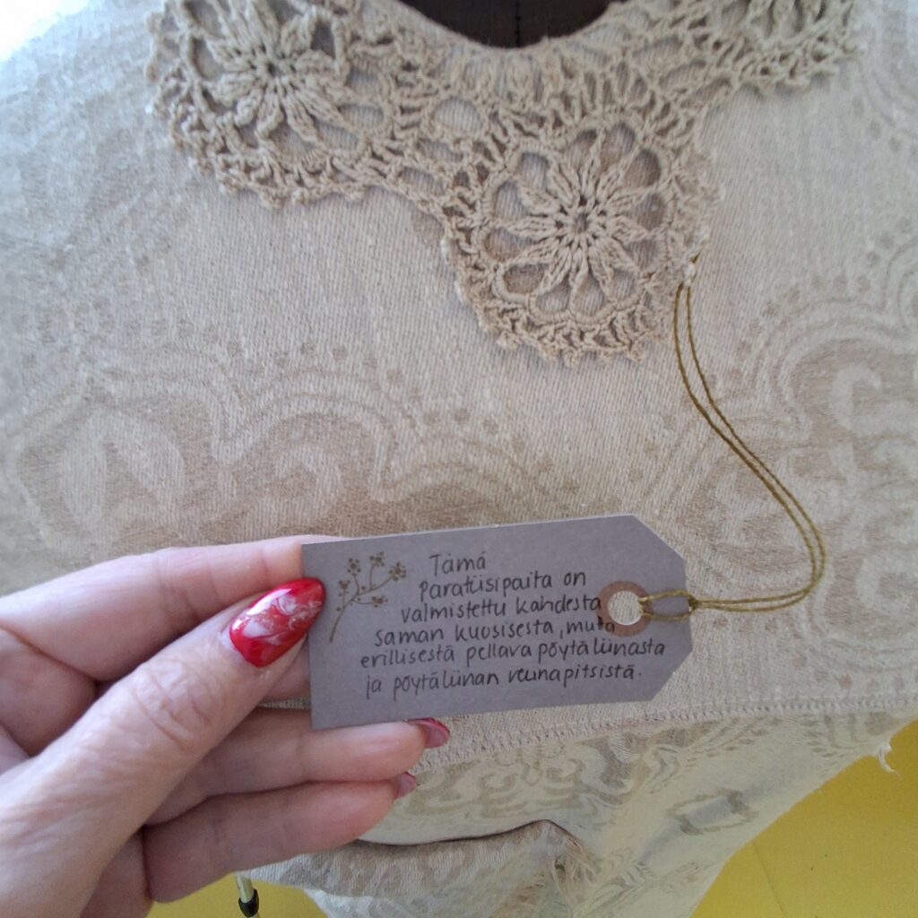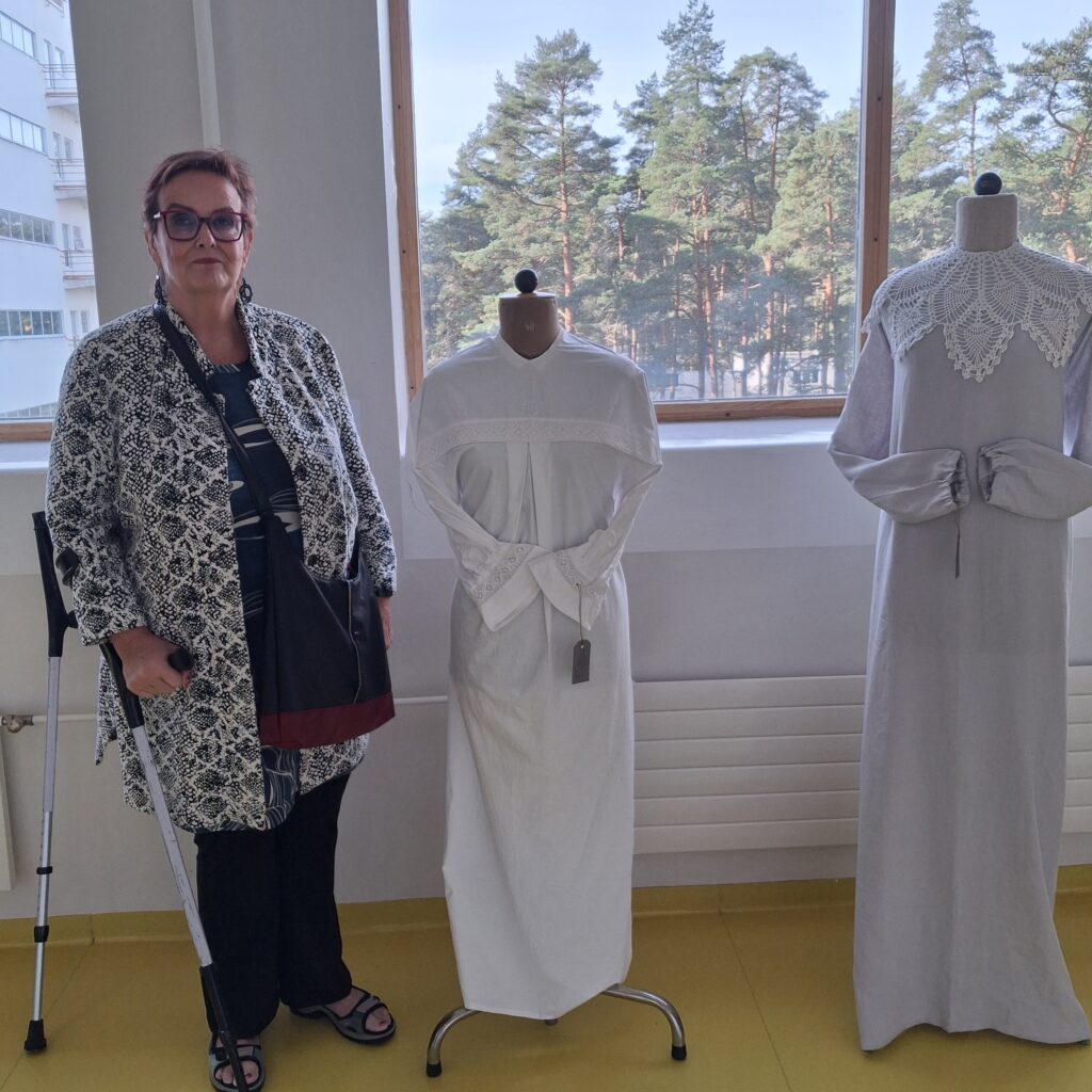 Ihan ensimmäisenä hätkähdyttivät Paratiisivaatteet. Katja Oksa on valmistanut nämä pitkät ”mekot” kierrätysmateriaaleista. Ne ovat siis kuolinpaitoja. Kauniita.