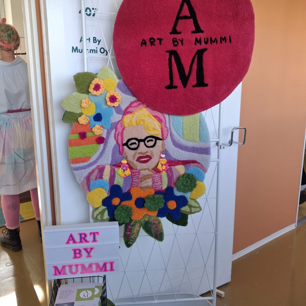 Lisäksi oli yksi kerros varattu tuote-esittelyille. Useampi yritys oli tuonut myyntinäyttelyyn kierrätystuotteita. Oli monta kiinnostavaa ideaa. Kun tämän kierroksen jälkeen poikkesimme parilla kirpputorilla, silmäni kummasti kiinnittyivät kirjoittuihin pöytäliinoihin ja yhden halvan ostinkin. Ehkä ompelen siitä liivin itselleni.