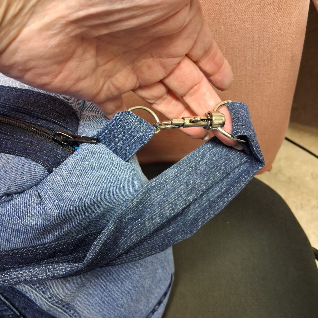 Sisäpuolelle ompelin vuoriin kaksi vetoketjullista taskua. Pikkuruinen tasku ulkopuolelle tuli peittämään saksien tekemää harhaviiltoa. Poiketen edellisestä kassista laitoin tähän olkahihnan tuollaisilla karbiinihakasilla kiinni ja tein sen myös säädettäväksi. Toinen pääty onnistui hyvin, toinen ei niinkään…