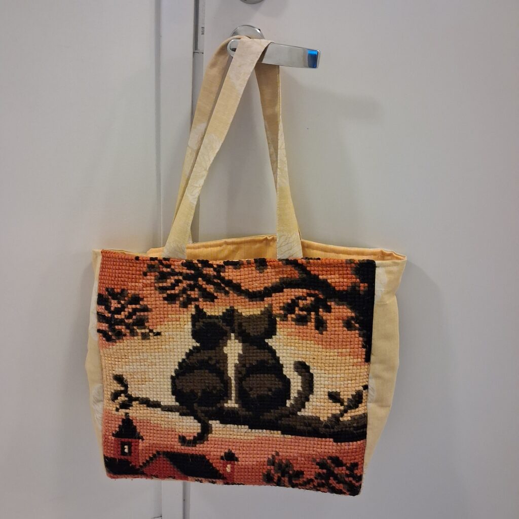 Taisin jo päättää, ettei enää farkkukasseja, mutta ehei, vielä ainakin yksi. Mutta sitä ennen ompelin ”välityönä” kissakassin. Löysin kierrätyskeskuksen ilmaistavaroista jonkun tekemän kanavatyön. Siitä on ehkä pitänyt tulla tyyny, mutta työ on jäänyt kesken. Minä näin sen kassina. Nämä molemmat, kissakassi ja jumppakassi syntyivät parissa tunnissa.