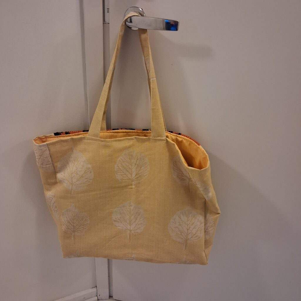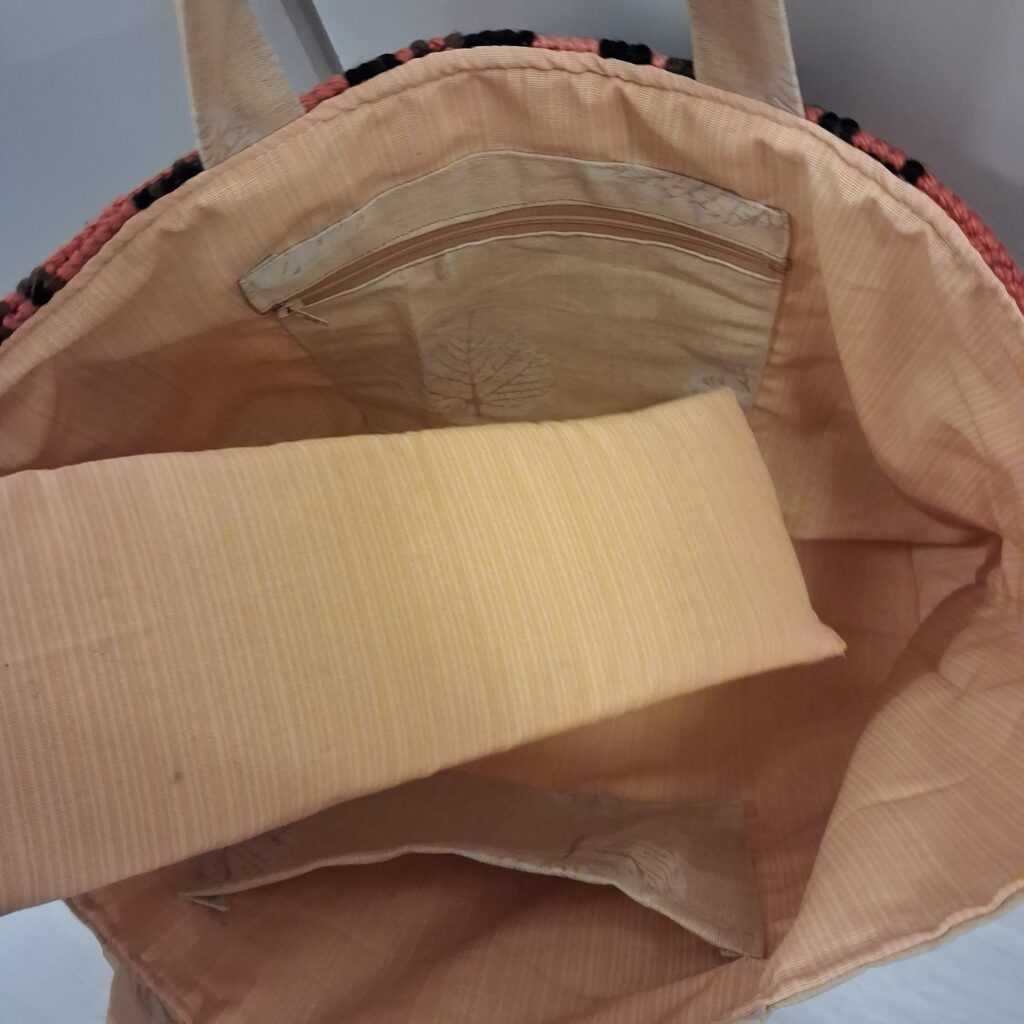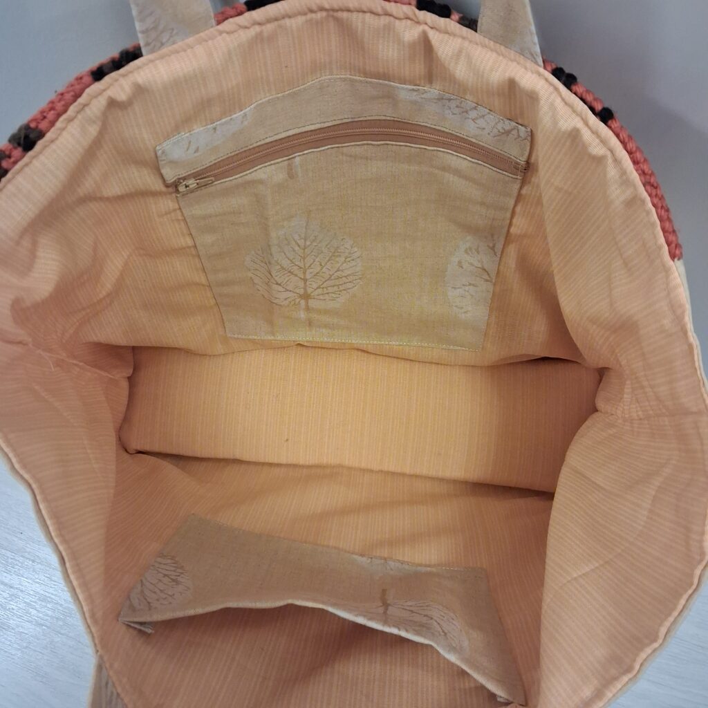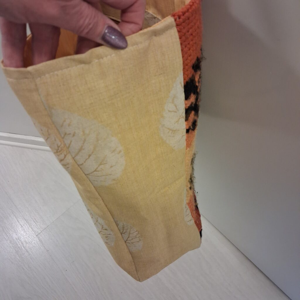 Kassi on ”vetelä”. En laittanut edes tukikangasta. Sisällä on vuori ja siinä kaksi taskua, toisen vetoketjullisena. Pohjaan laitoin pahvin, jonka päällystin ja sisälle laitoin vielä toisesta projektista jääneen superlonkin palasen.