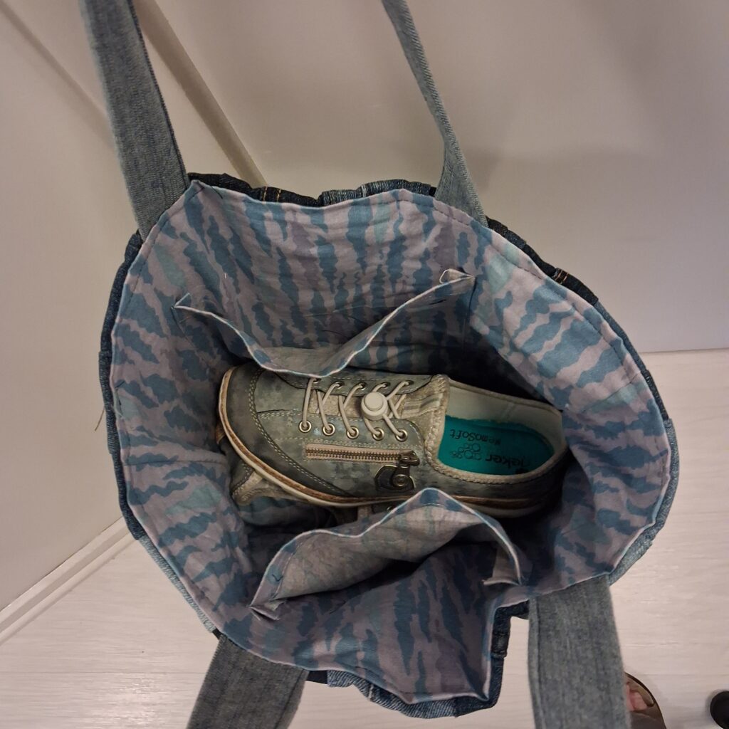 KUntosalilla olen käyttänyt sellaista kahvipussikassia, mikä on ollut hyvän mallinen, kun pysyy pystyssä. SE on kuitenkin liian pieni ja aina saan hakea avaimia ja kuulokkeita pohjalta. Olisin halunnut tästä farkkutilkkukassista samanlaisen jämäkän, mutta eipä ollutkaan sopivaa tukevaa tukikangasta/pahvia. Niinpä se saa kelvata, vaikka vähän lötkö onkin.