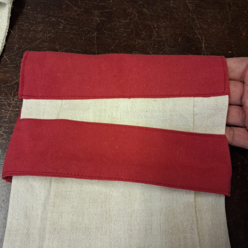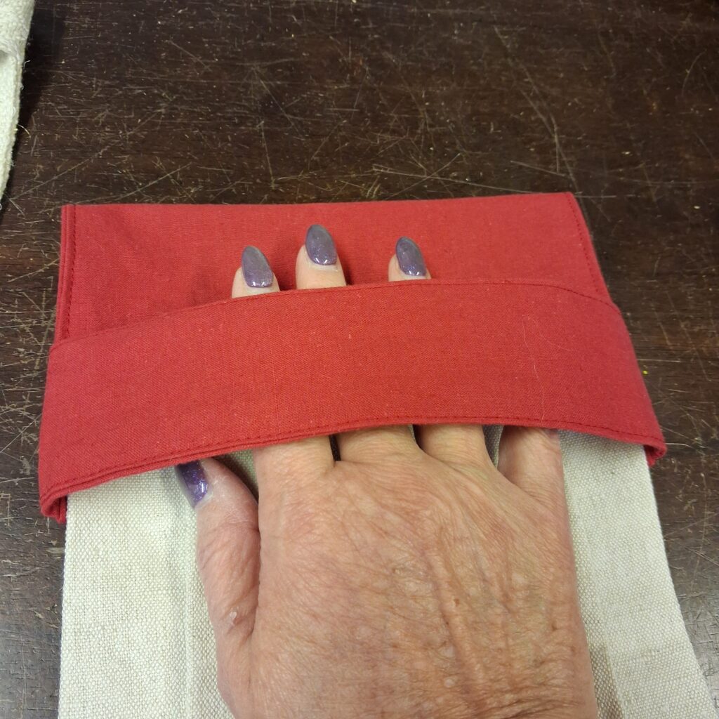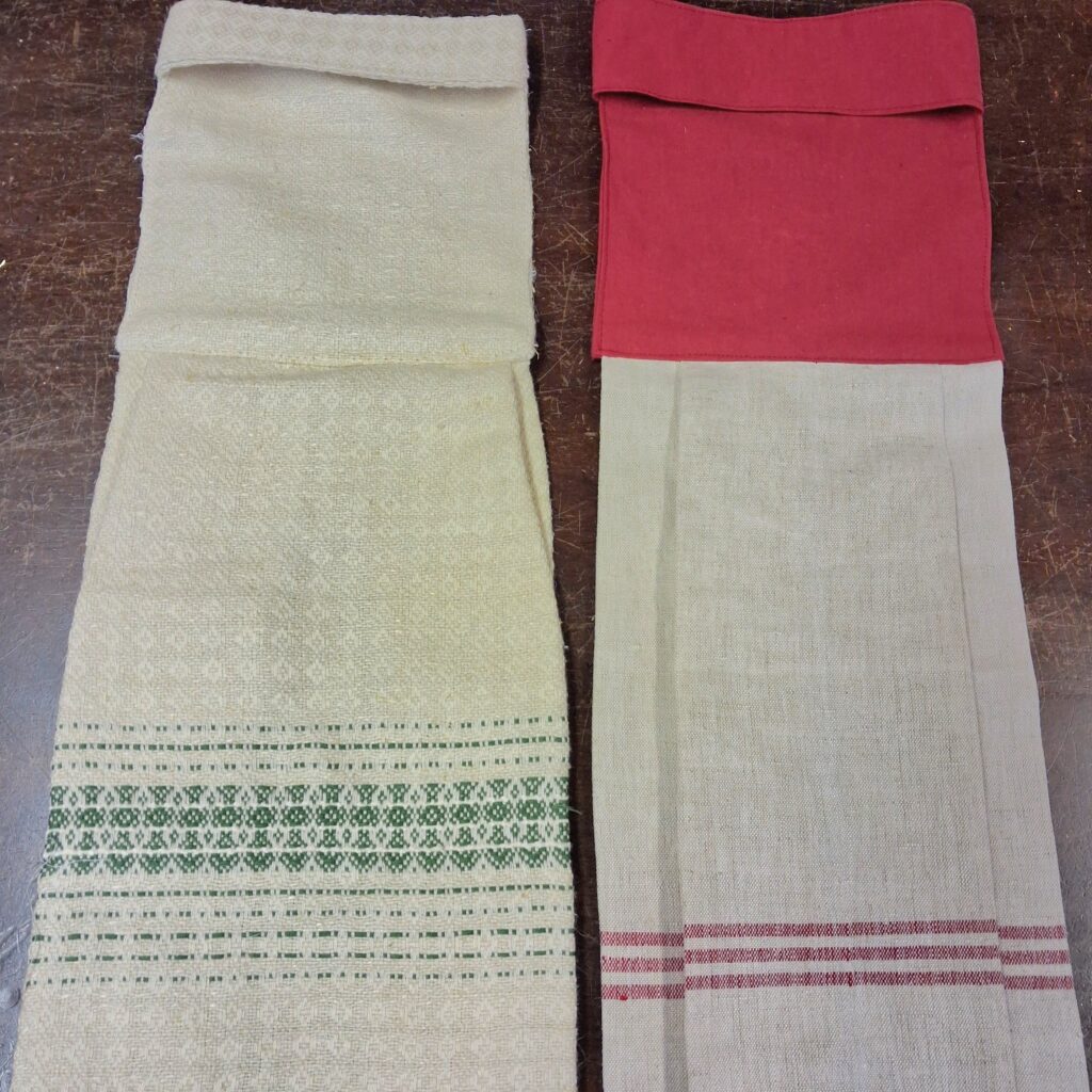 Olen ommellut näppipyyhkeitä jo 20 vuotta. Malli on pysynyt melkein samana. Joulua varten halusin taas urakoida muutamat näppipyyhkeet. Mieleeni tuli hatara kuva jostain netin syövereistä. Siinä pyyhkeen idea on sama, mutta kiinnitystapa erilainen. Ei nappia, ei nauhoja. Koska en kuvaa heti löytänyt, aloin itse harjoitella mallia. En edes näytä, minkälainen ensimmäinen prototyyppi oli – täysin toimimaton! Tiedän, että minun aivoni eivät toimi oikein hyvin hahmotustehtävissä. Pinterestistä toki löytyy monenlaista mallia, mutta minä haluan helpon ja nopean mallin valmistaa. Tässä nyt siis esittelyssä uusi näppipyyhe – uusi malli