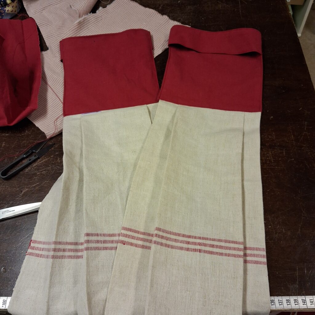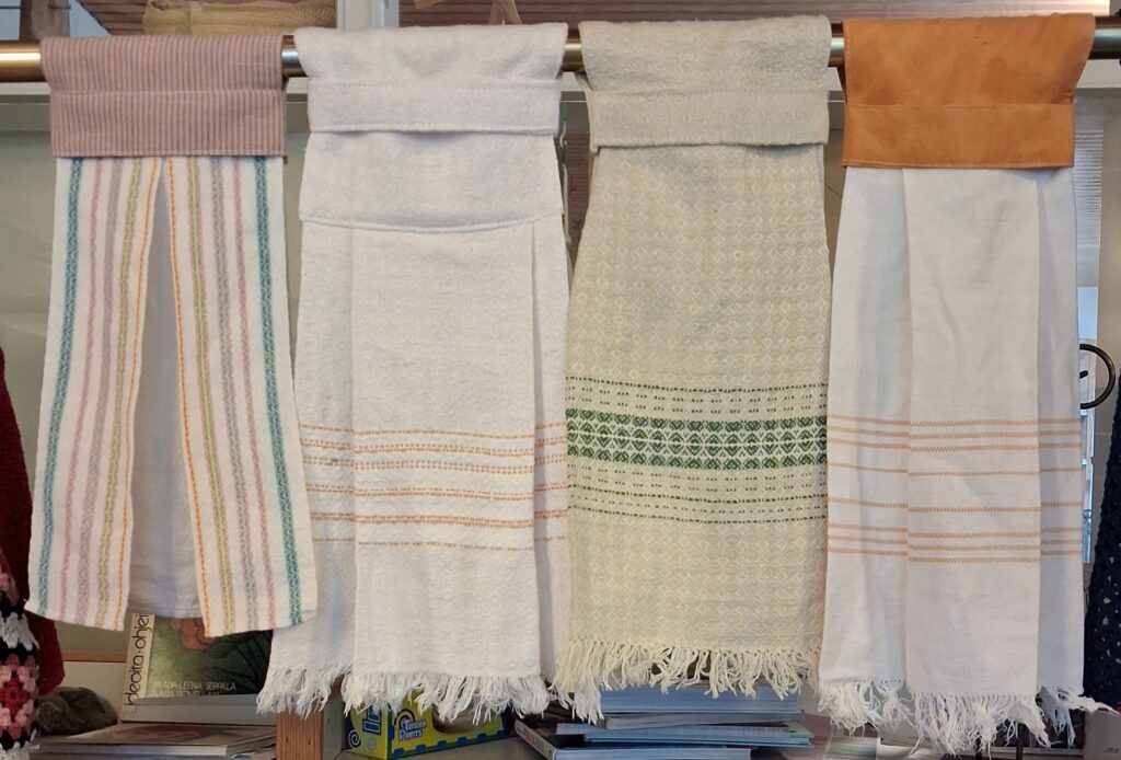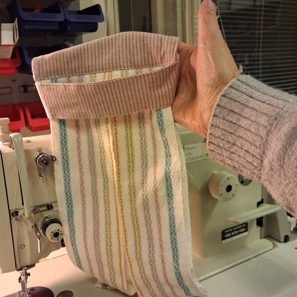 ”Vaikein” kohta tuon tekemisessä on saada pyyhkeen taitteet tehtyä niin, että sen leveys sopii yläosaan. Tietysti voisi tehdä itsellensä kaavion, mutta minähän en etukäteen mitään suunnittele. Kun tämän ompelujärjestyksen oppii, näitä kyllä syntyy nopeasti. Ja jos on valmista kangasta niin, että kaikki pyyhkeet tulevat samankokoisiksi, ei tarvitse mittojakaan pähkäillä. Toisaalta näissä valmiissa pyyhkeissä (ovat muuten kangaspuissa kudotut) on se hyvä puoli, ettei tarvitse yhtään reunaa ommella tai huolitella!