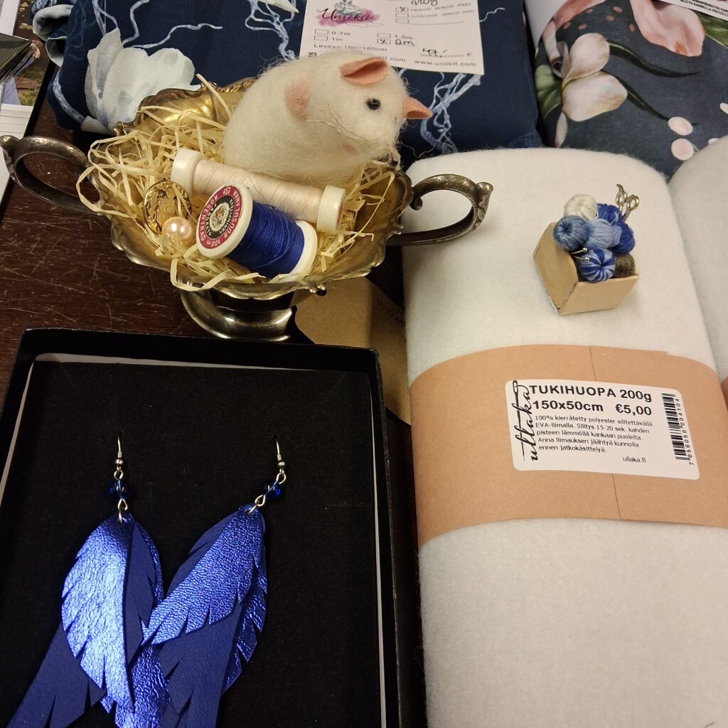 Ja yhdet korvikset – vaikkei olisi ollut lupaa ostaa. Mutta kun niin siniset ja niin isot. Ja nuo söpöt koristeet. Hiirien valmistaja oli tehdessään messutuotteita ajatellut minua. Meille ei alusta saa olla särkyvää, kun yleensä putoavat lattialle. Nyt on kylläkin nostettu seinälle, mutta silti.