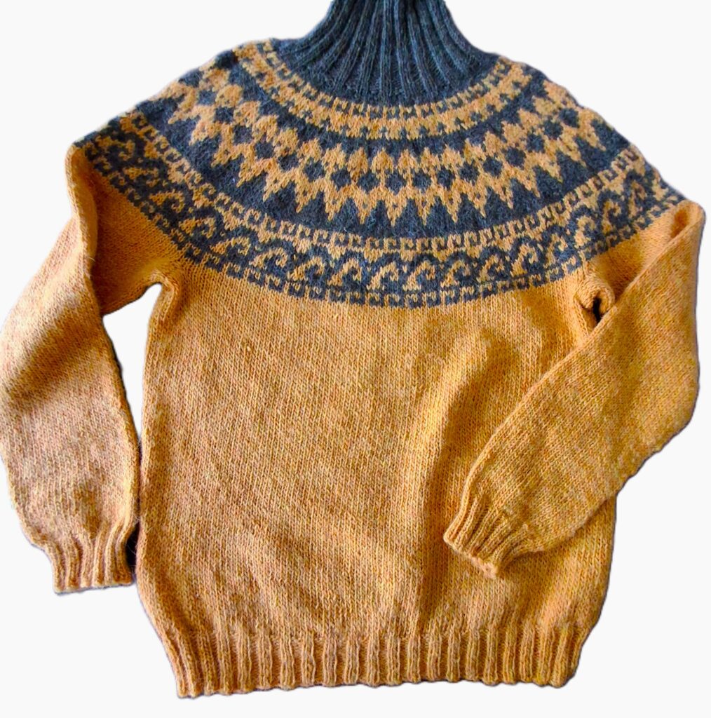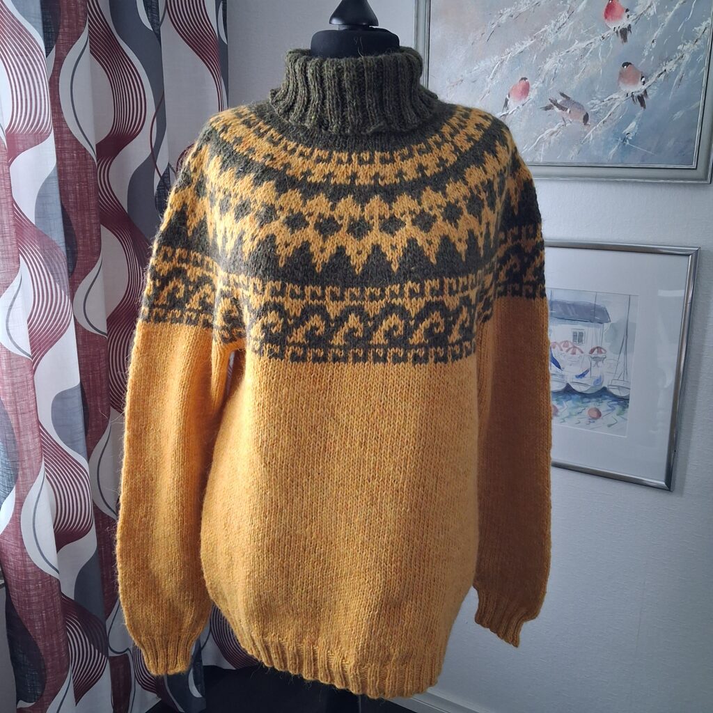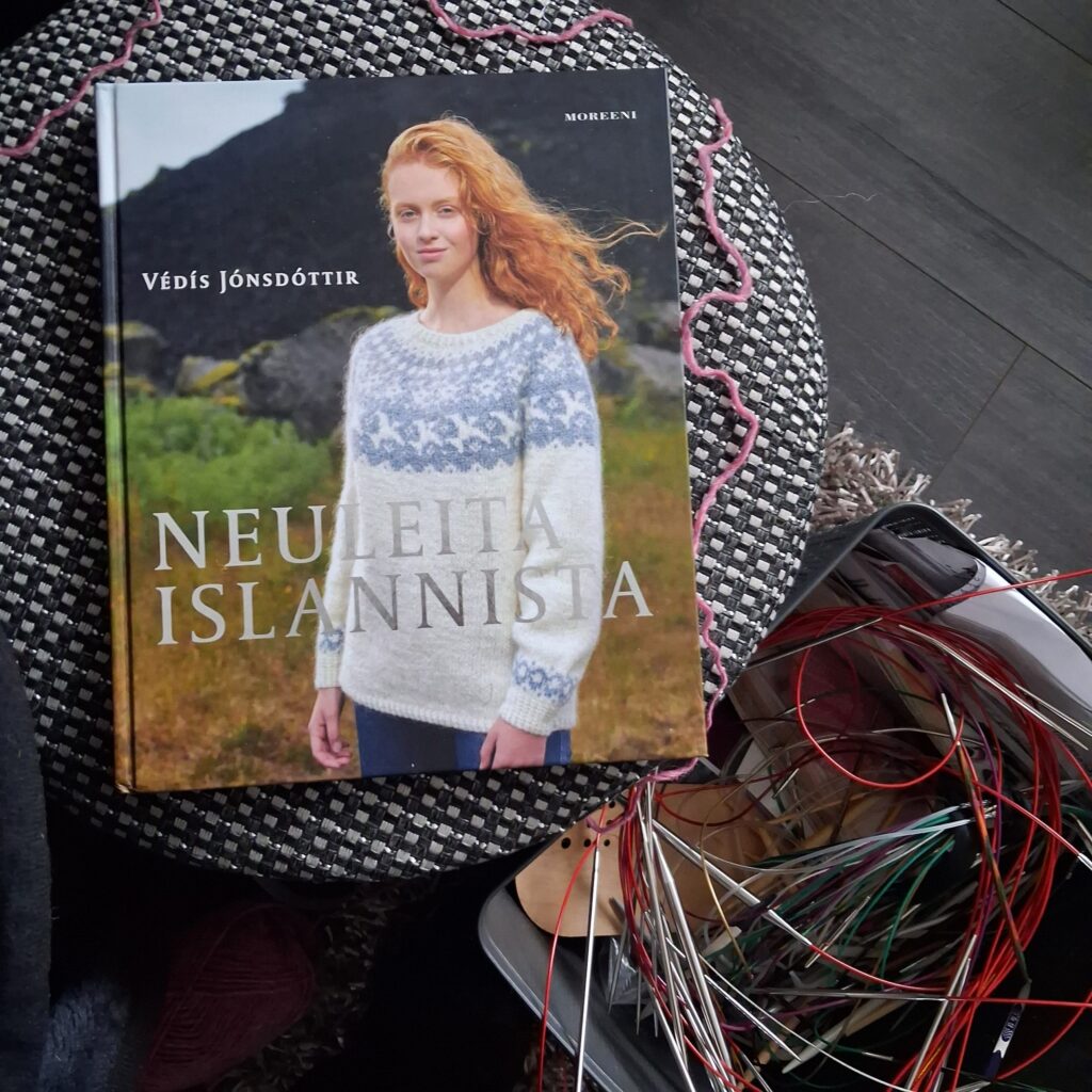 Nyt innostuin taas uudestaan islannin villalangoista ja paidoista. Ihan vaan huvikseni neuloin aivan uuden mallin – siis itselleni uuden. En ole tästä kirjasta ennen mitään muutakaan tehnyt. Vedis Jonsdottirin Neuleita Islannistä (moreeni)