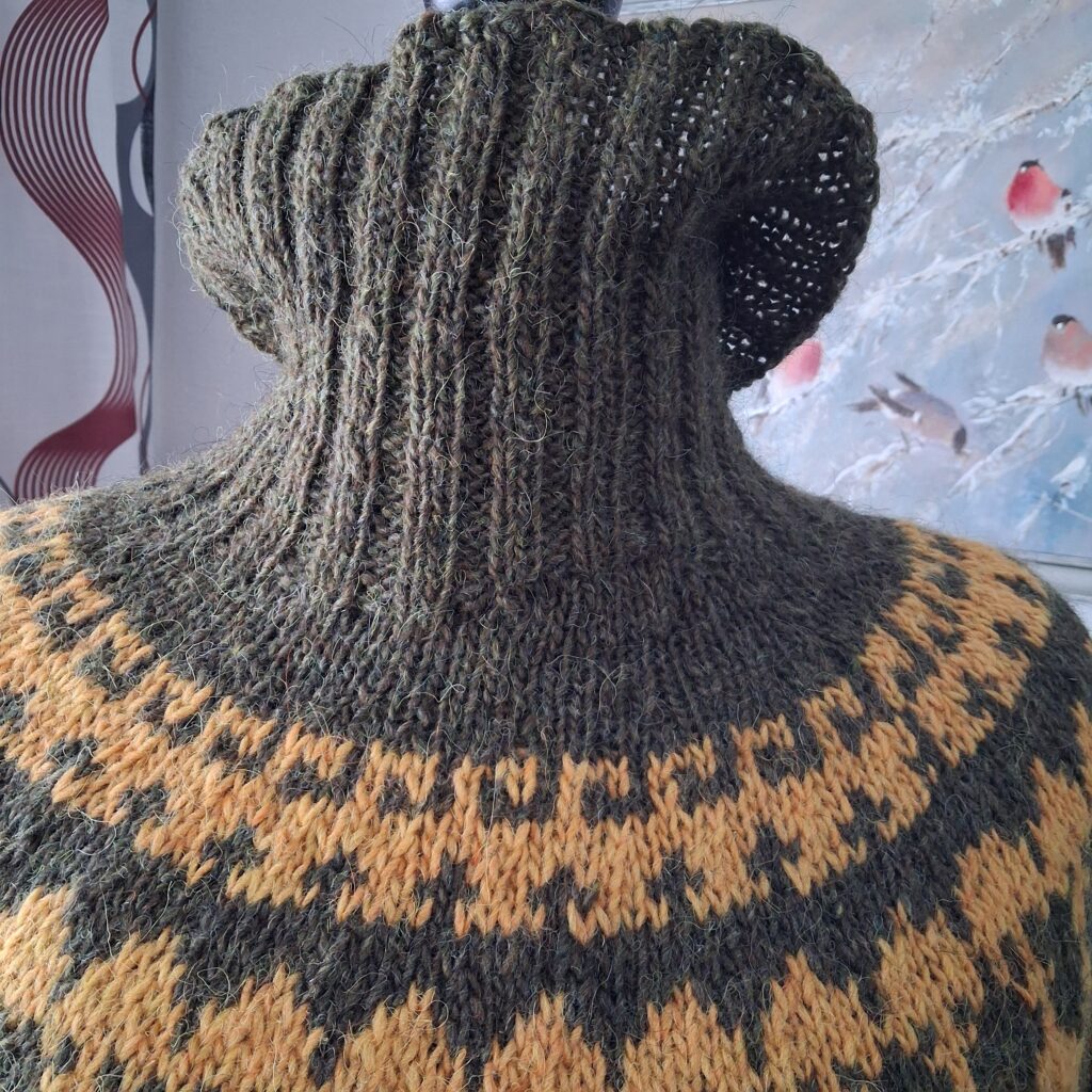 Olipa mukava neuloa – pitkästä aikaa – paitaa! Nyt kun olen noin 30 kirjoneuleista paitaa neulonut, alan oppi lankojen kuljetuksen ja silmukoitten sitomisen ja lankadominanssinkin, vaikken sitä mitenkään orjallisesti noudata. Lettlopin eri väreissä on suuriakin eroja langan paksuudessa. Tässäkin vihreä oli ”kiinteämpää” ja keltainen höttösempää, joten ne itsepäisesti asettuivat sormelle miten halusivat…