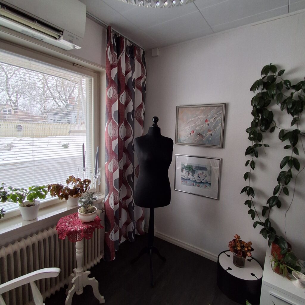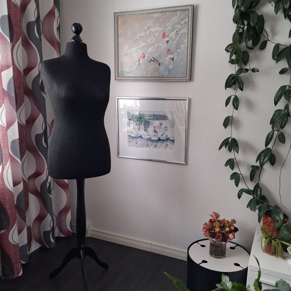 Aivan mainiota ja helppoa minulle, kun on olohuoneessa tyhjä mallinukke, jolle saa heti puettua valmiin vaatteen. Ostin näitä nukkeja monta, kun sain halvalla. Osa on puodin eteisessä, mutta tämä kaunein päätyi kodin somistukseksi.