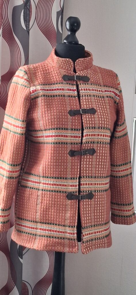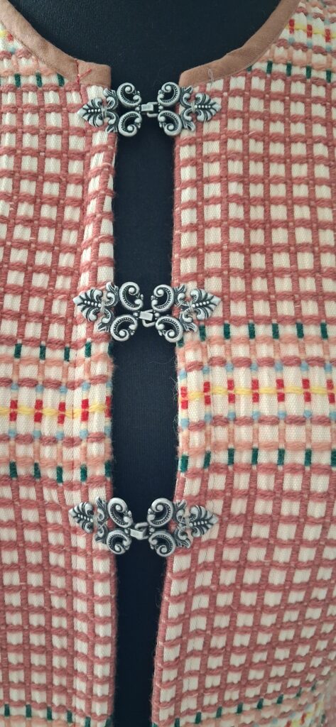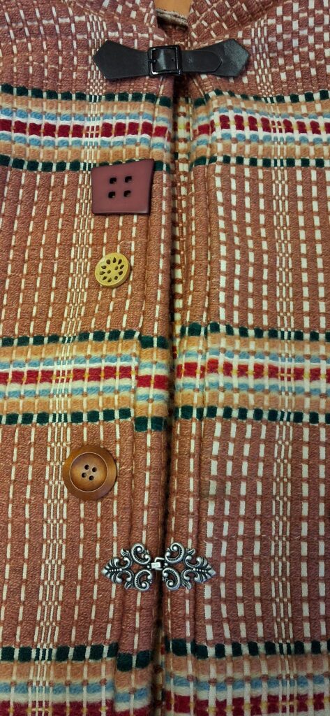 Aiempiin takkeihin olen laittanut hupun, mutta tämä, vaikka on samalla kaavalla tehty, on tyyliltään erilainen. Tähän halusin pienen pystykauluksen. Kaikki muu sujui ”kuin itsekseen”, mutta kiinnityssysteemiä jouduin miettimään tovin. Olin jo kiinnittänyt kauluksen, enkä halunnut sitä enää purkaa, joten siitäkin aiheutui lisää miettimistä. Löysin monet kivat napit, mutta arvelin, että napinläpien ompelu näin paksuun kankaaseen saattaisi olla liian haastavaa, Sitten sain ahaa-elämyksen! Minullahan on tuollaisia nahkasolkia, vaikka ei ne kylläkään oikeaa nahkaa ole. Ihan täydelliset tämän jakun tyyliin.