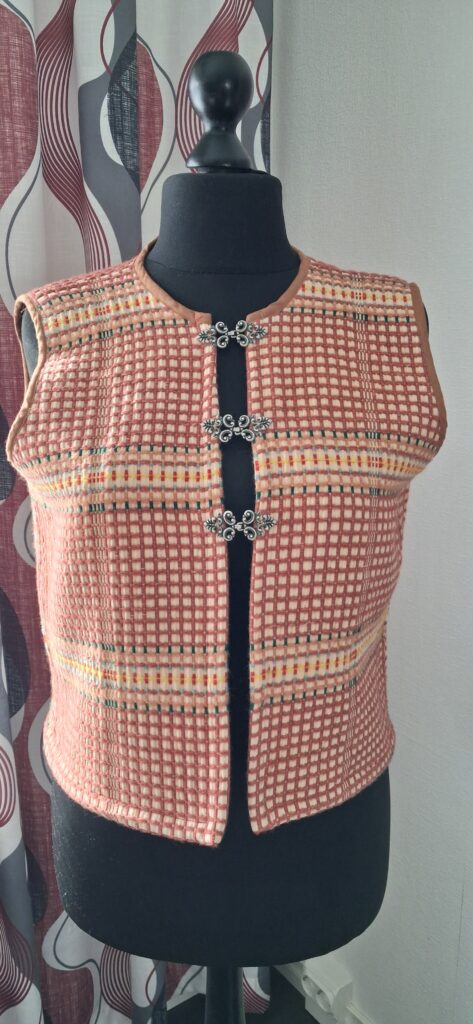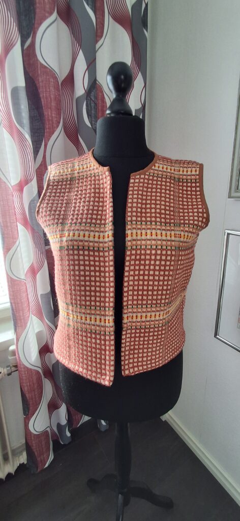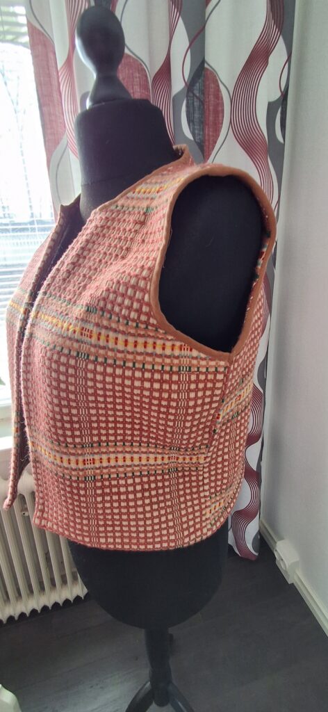 Kangasta jäi vielä kapea soiro ja kun oikein taiteilin kaavan kanssa, sain siitä vielä liivinkin. Laitoin kankaan toisin puolin, vaaleamman puolen päälleppäin.