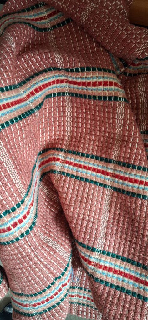 Kirpputorilta löysin päiväpeitteen. Sen hinta oli ollut 5 €, mutta oli nyt alennettu ja maksoin siitä 3,50 €. Sen on joku kangaspuissa kutonut. Kaksi kaistaletta oli ommeltu yhteen ja peite oli todella painava. En ollut varma, saako siitä mitään tehtyä juurikin tuon painon takia. Laitettuani peitteen pesukoneeseen, siihen tuli muutama reikä, mutta niitä väistellen sain leikattua takin. Minulla on luottokaava, jolla olen tehnyt jo monen monta takkia. Tämä taisi olla ensimmäinen.