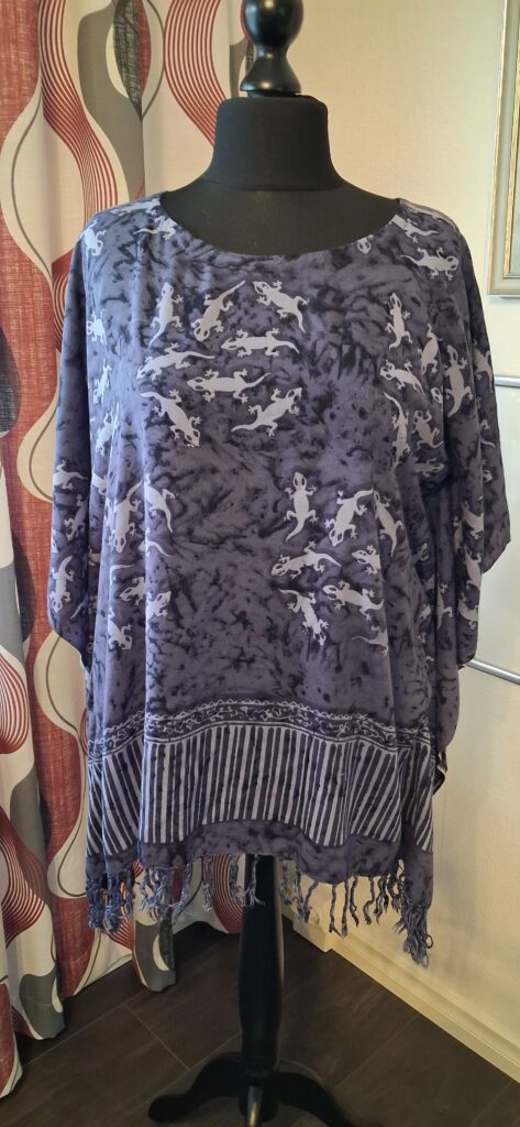 Toinen huitula syntyi isosta tuubihuivista. Siihen leikkasin sivusaumat jättäen pienet hihat. Pääntien tein samalla tavalla vinonauhalla, mutta nyt jätin vinonauhan etupuolelle, koska niin hienosti sopii väriin. Tästä tulikin lähes mekko.
