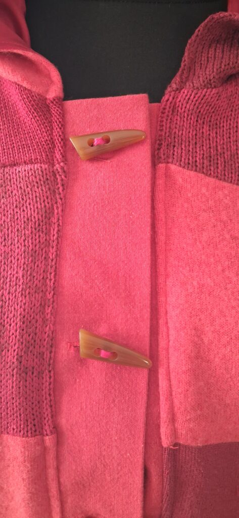 Punaisia nappeja ei satojen nappieni joukosta löytynyt ja koska kuitenkin halusin takin valmiiksi nyt justiinsa, piti tehdä kompromissi. Valitsin tuollaiset rusehtavat ”duffelinnapit”,