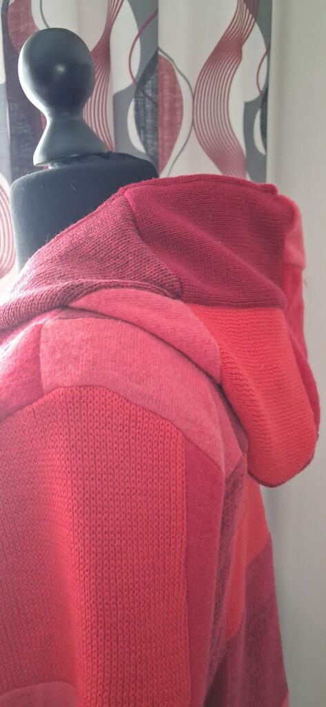 Neuletakin idea on kypsynyt jo kauan. Siitä lähtien, kun eräs asiakas toi korjattavaksi oman neulepaloista kootun takkinsa. Päätin jo silloin yrittää itsekin koota sellaisen. Olenkin sitten tuonut kierrätyskeskuksesta neulevaatteita – sellaisia, jotka sopivat takiksi. Tein eriväristen kasoja: siniset, violetit, mustat ja harmaat ja sitten punaiset.