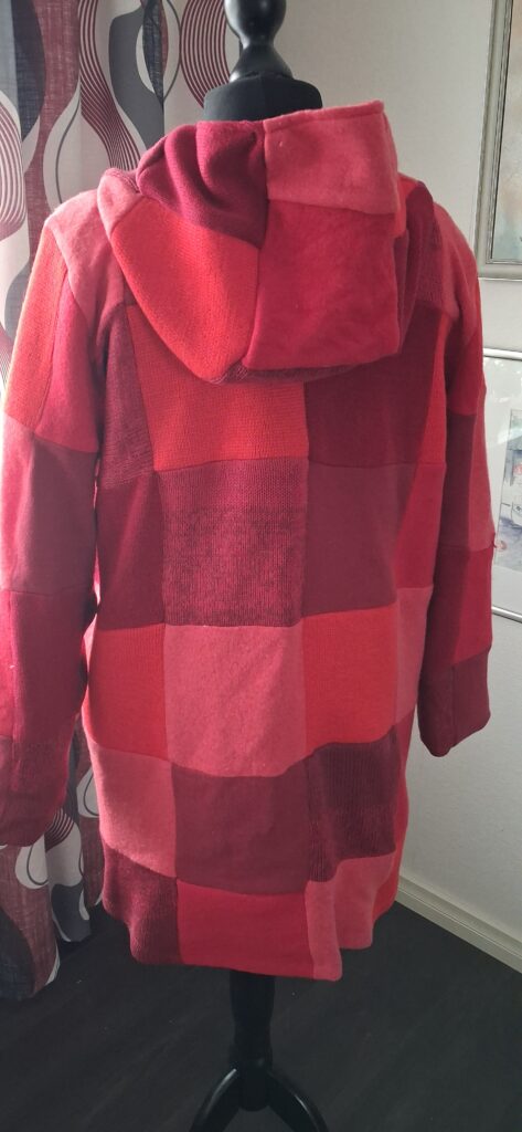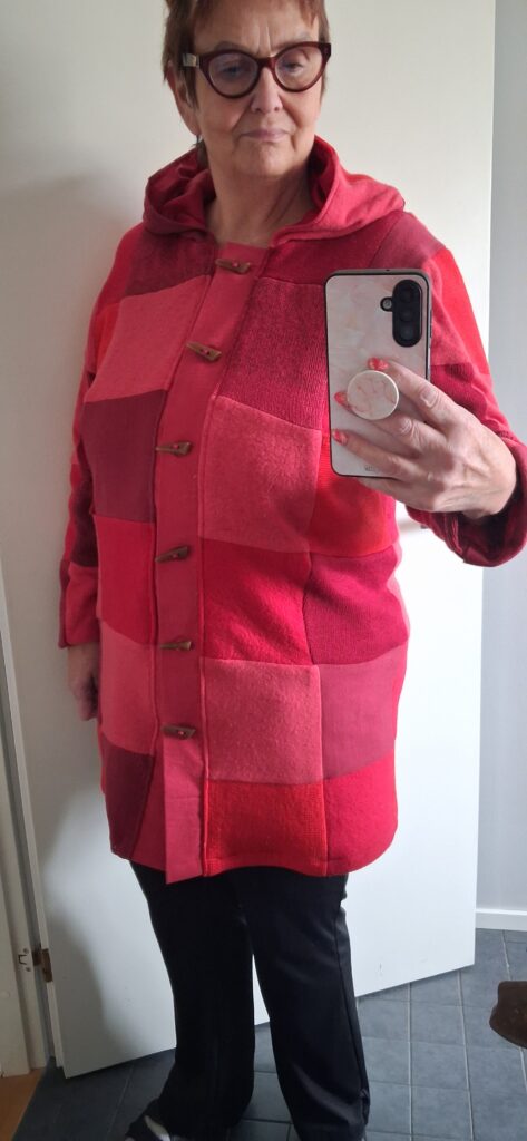 Nuo punaiset näyttivät ensin niin erisävyisiltä, että olin kovin epävarma, voiko niitä yhdistää samaan takkiin. Mutta lopputulos osoittaa, että kyllä voi, kunhan vierekkäiset sopivat toisiinsa. Sinne upposivat kylmän sinipunaiset ja lämpiman kellanpunaiset tilkut. Kaavana on sama, millä olen kaikki tänä talvena ompelemani takit tehnyt. Peruskaava, helppo ja hyvä. Se on suunniteltu joustamattomalle kankaalle, mutta käy myös joustamattomalle – sen olen itse todennut.