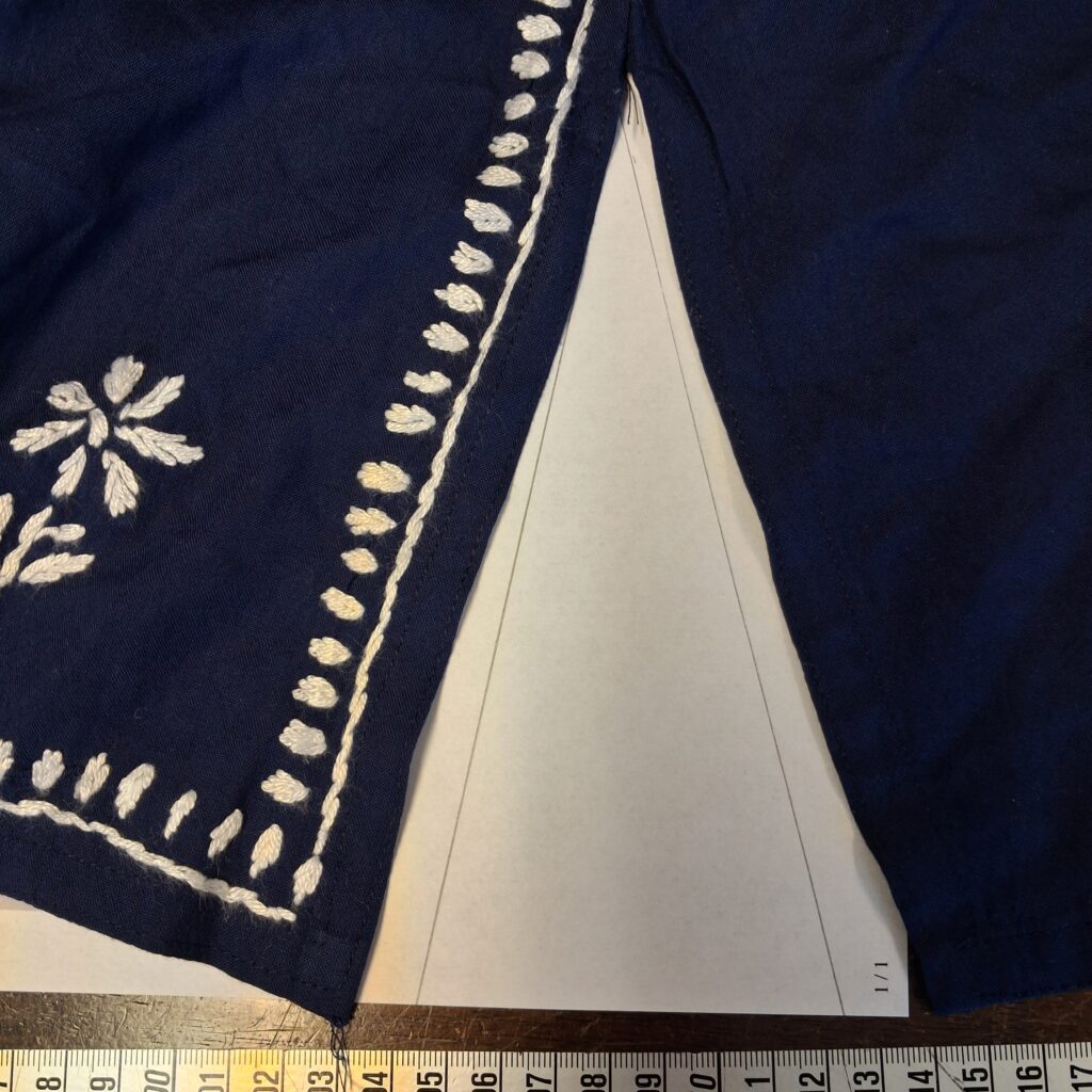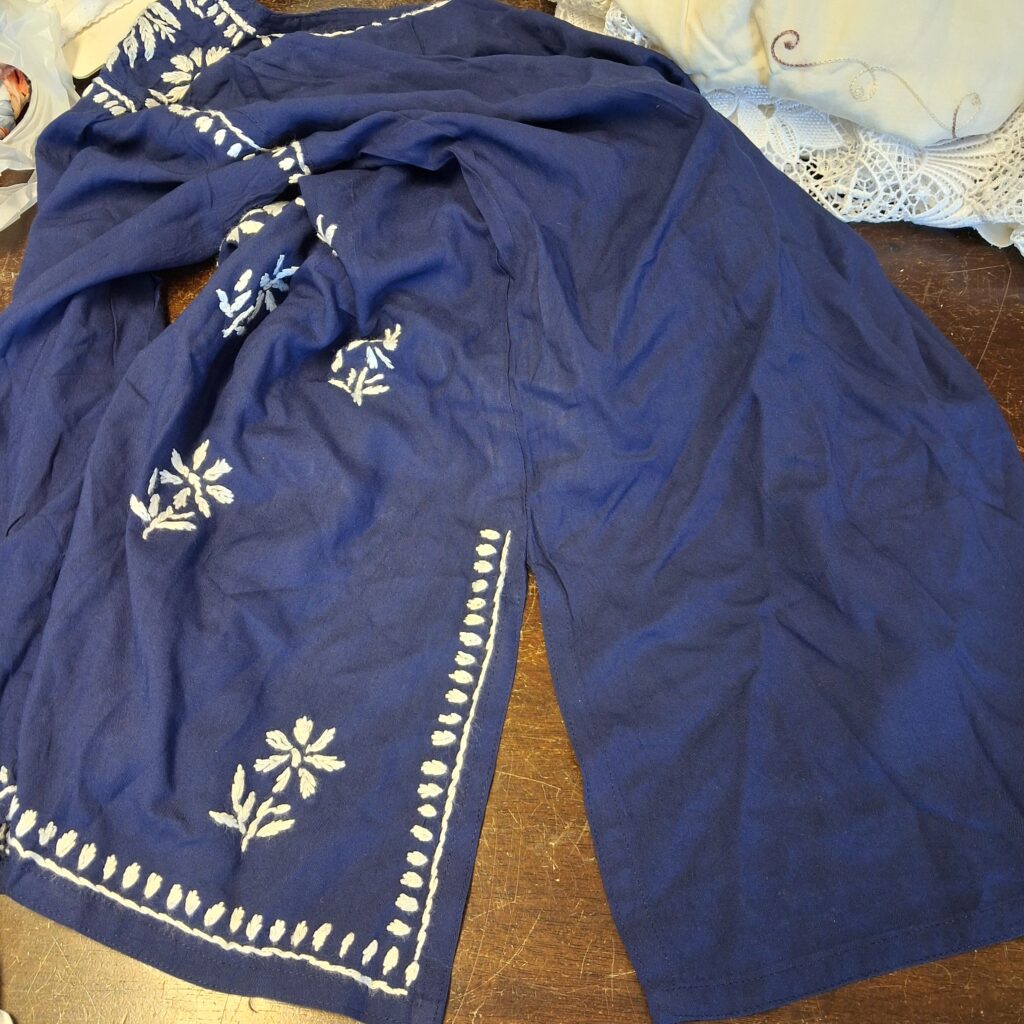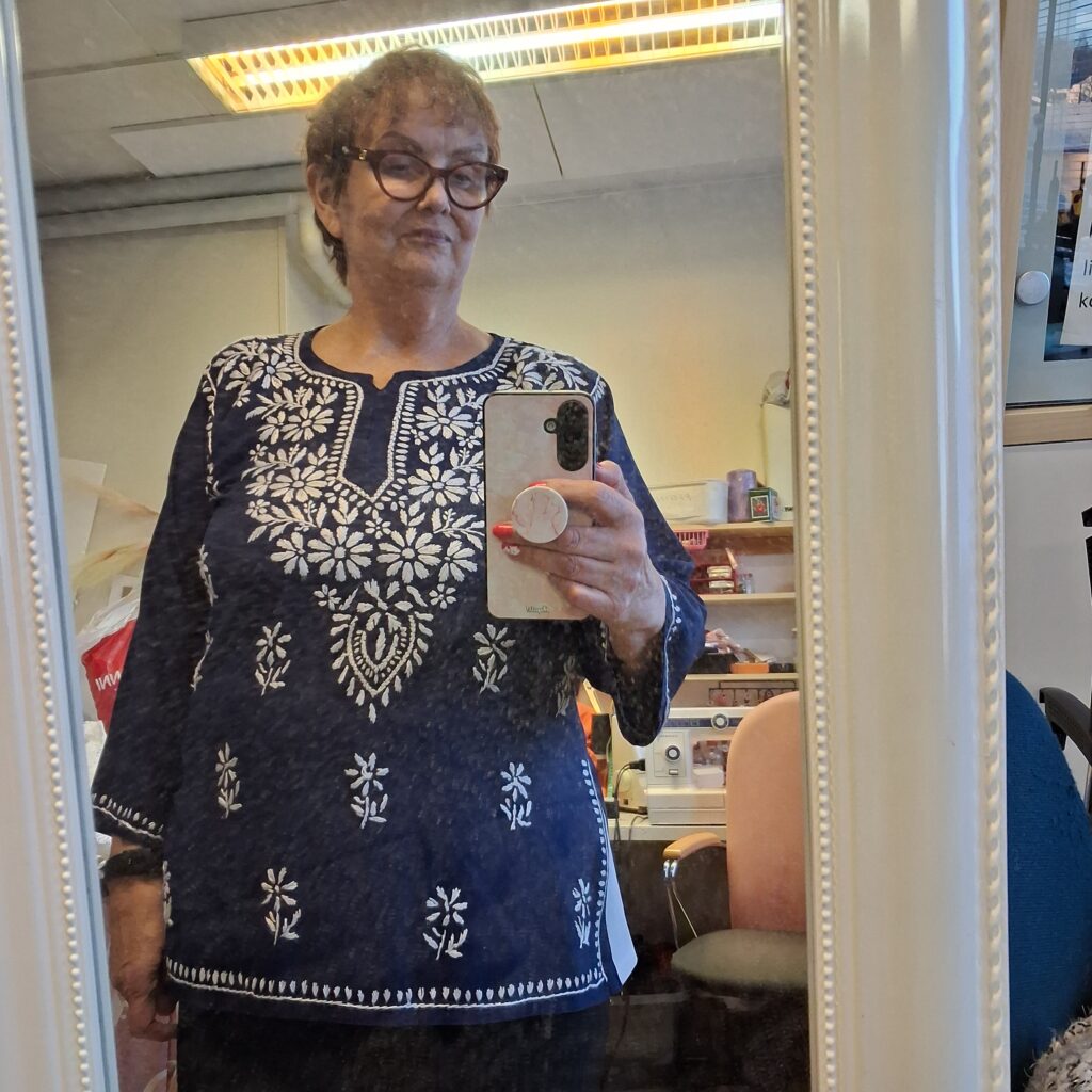 Ostin Intian reissulla jostain basaarista kauniin puseron. Mukanani oli mittanauha ja tarkistinkin, että rinnanympärys on tarpeeksi. Muuten en puseroa sovittanut. Koska rakastan sinistä, tämä oli – ja on – mielestäni kaunein Intiassa näkemistäni asuista. Kotona vaatteen lähempi tarkastelu osoitti, että työn jälki oli kehnoa, mutta mitäpä halpaan hintaan voisi muuta olettaakkaan. Pusero vaati siis pientä korjausta.