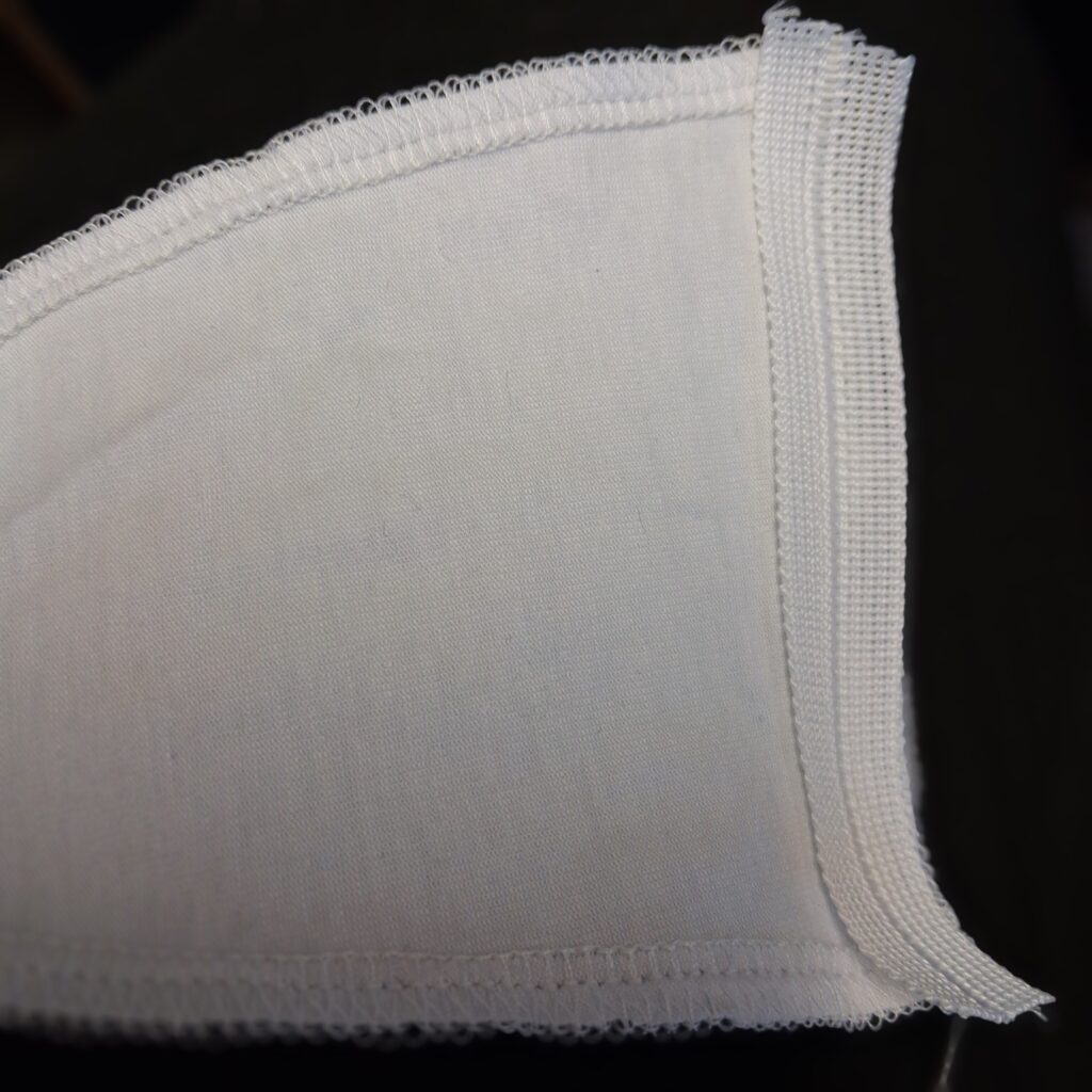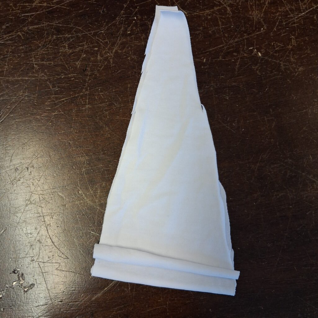 Päätin ommella halkioon kiilat. Valitsin hiukan joustavaa trikoota ja koska samansävyistä sinistä ei löytynyt varastoistani, päädyin valkoiseen.