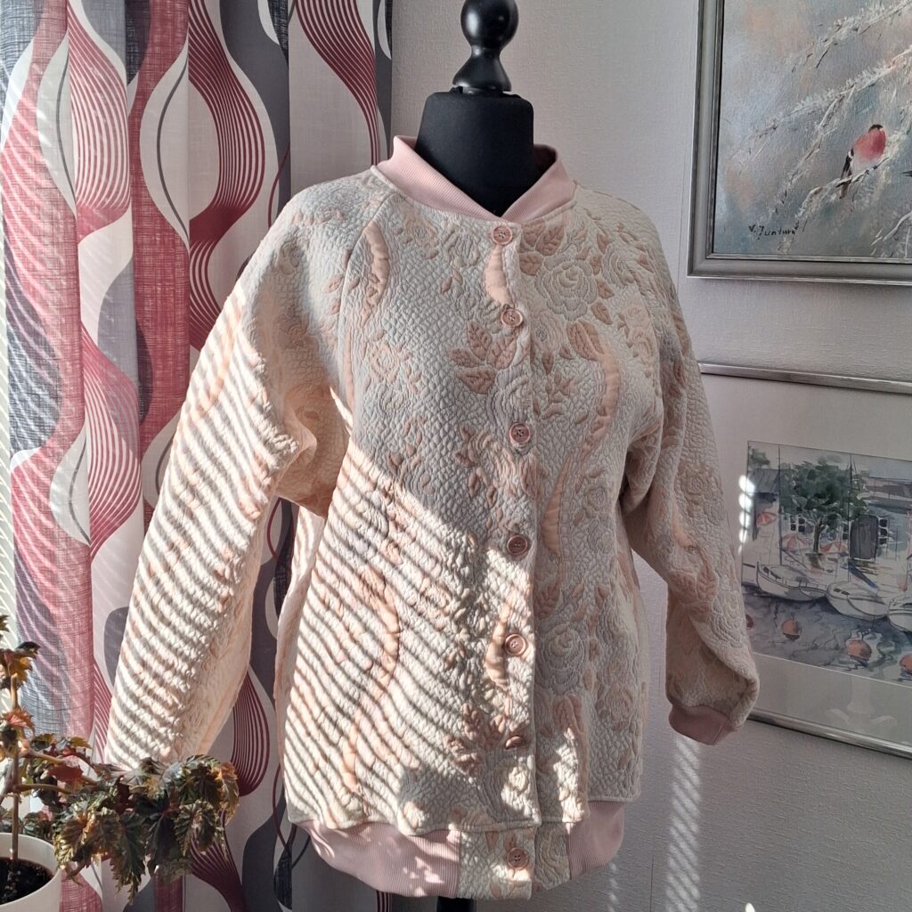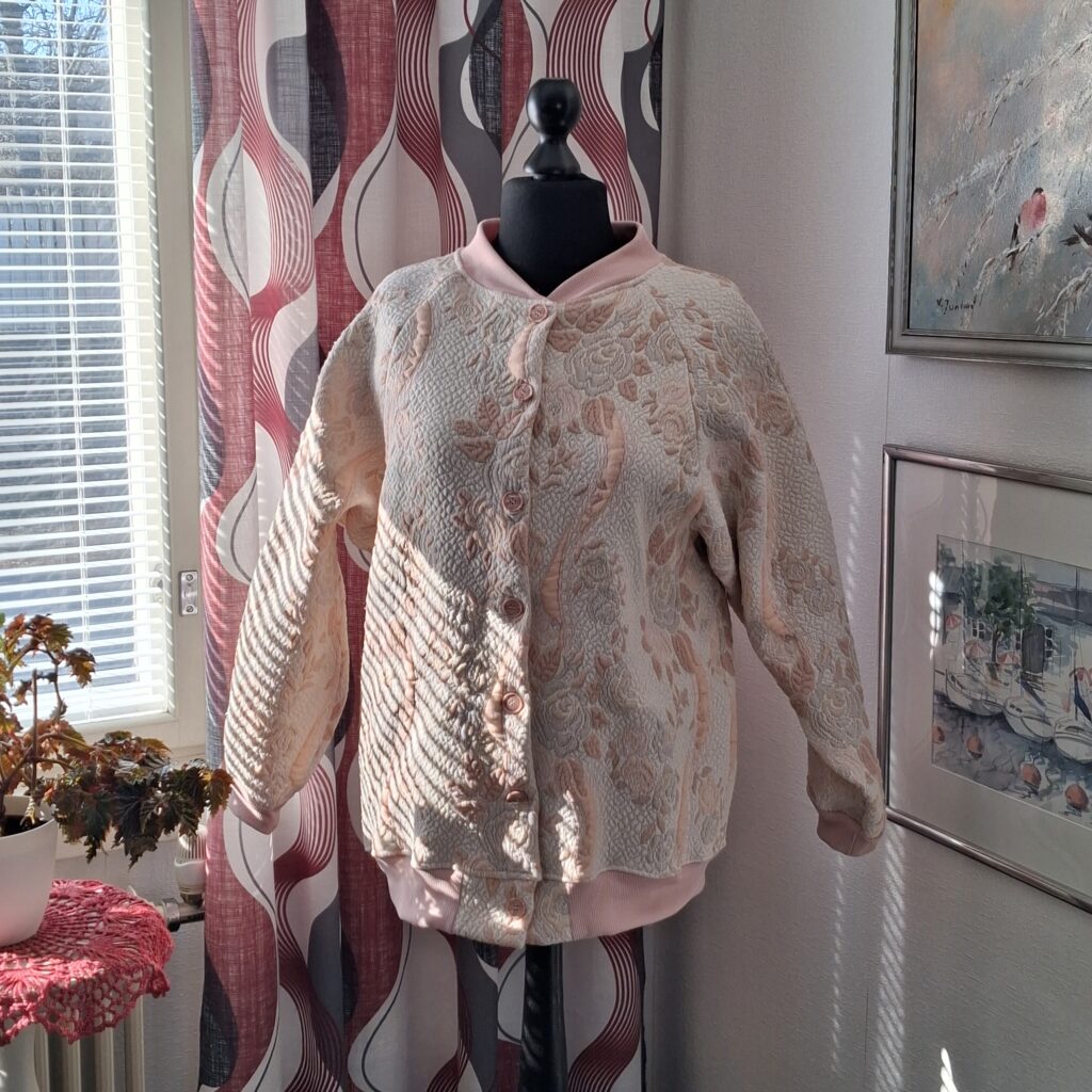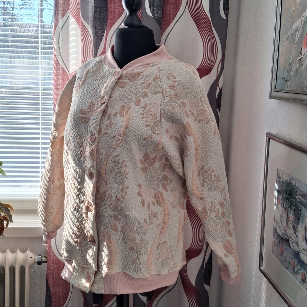 Kun näin tämän päiväpeitteen kierrätyskeskuksen ilmaishyllyllä, tiesin heti, että haluan tehdä siitä bomber-takin. Ikinä en itse ole sellaista käyttänyt, enkä myöskään tehnyt. Eikä tästä nyt ollenkaan perinteinen bomber-takki tullutkaan. Mutta idea.