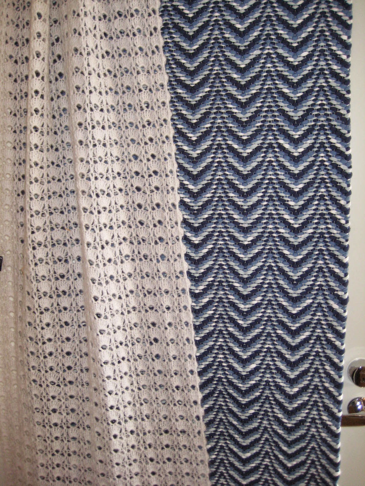 Putiikissa on vähän hyvää kuvaustaustaa. Huomasin, että tuohon oven päälle voi ripustaa tavaraa enemmänkin. Mielestäni kaunis yhdistelmä tämä sinivalkoinen. Maton päällä on Angora-langasta virkkaamani huivi.