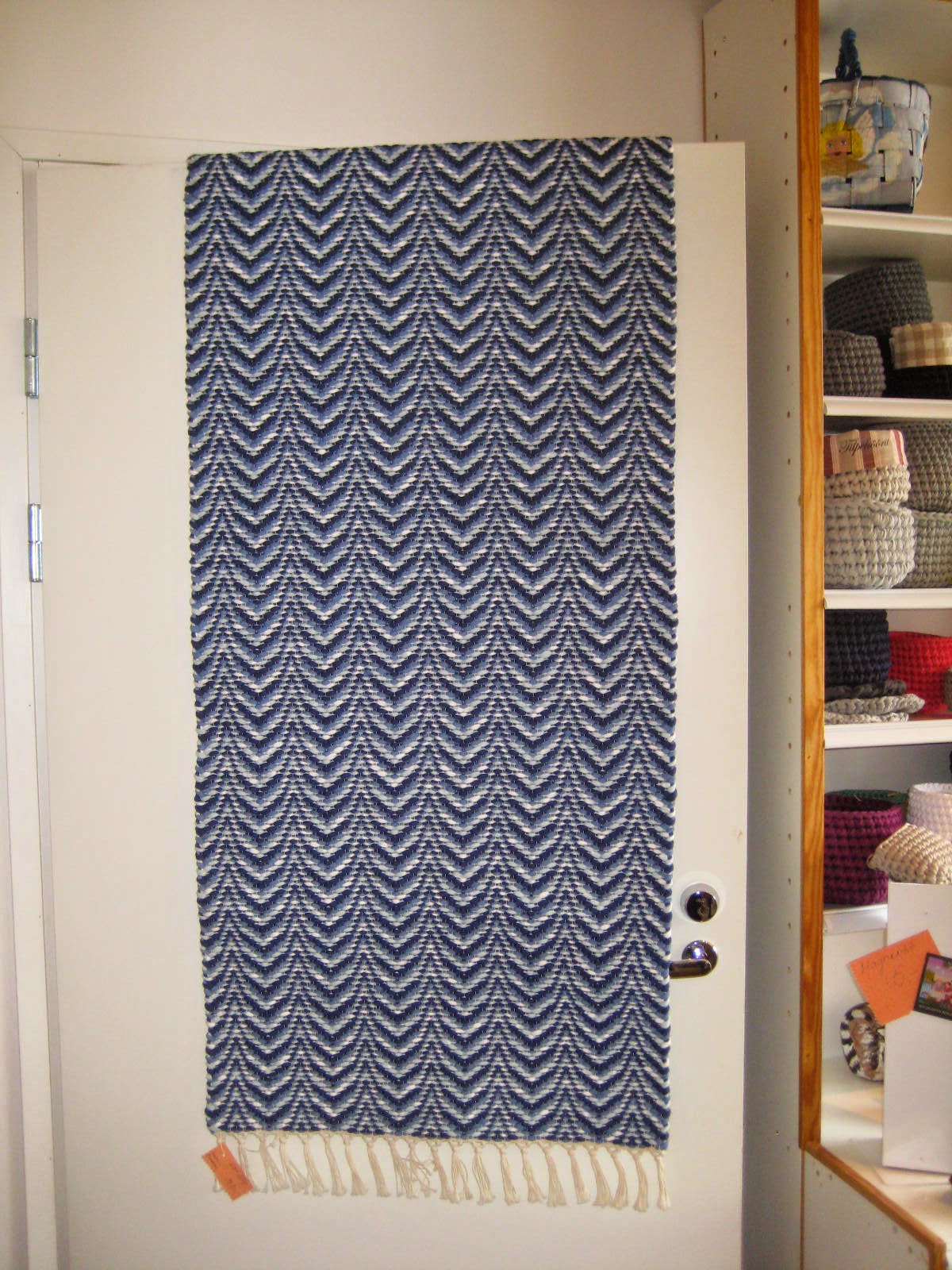 Kuvauspaikaksi valitsiimme oveen ripustetun maton. Maton on kutonut Salme Ruoranen ja se on nimeltään KIRKONKAARI, jos oikein muistan.