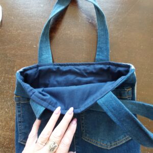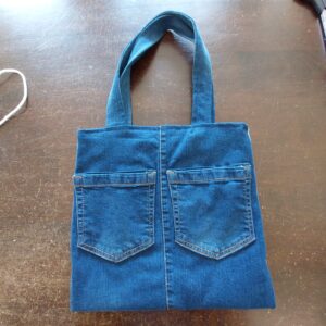 Erilaisista farkkukankaisista tilkuista ommeltu tukeva kassi.