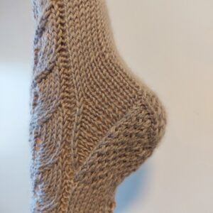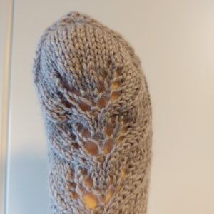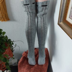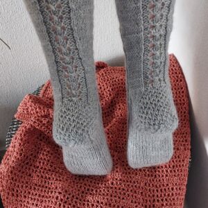 Käsin neulottu, laadukkaasta langasta, kauniit pitsikuviolliset pitkät sukat.