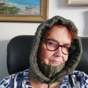 Laadukkaasta langasta virkattu huppupäähine, jossa on kiinteästi myös kauluri.