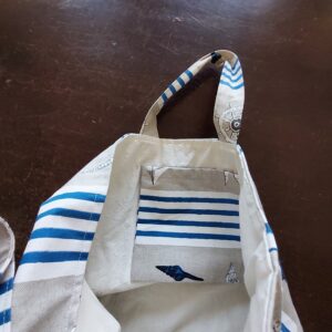 Meriaiheinen, sinivalkoinen kangaskassi.