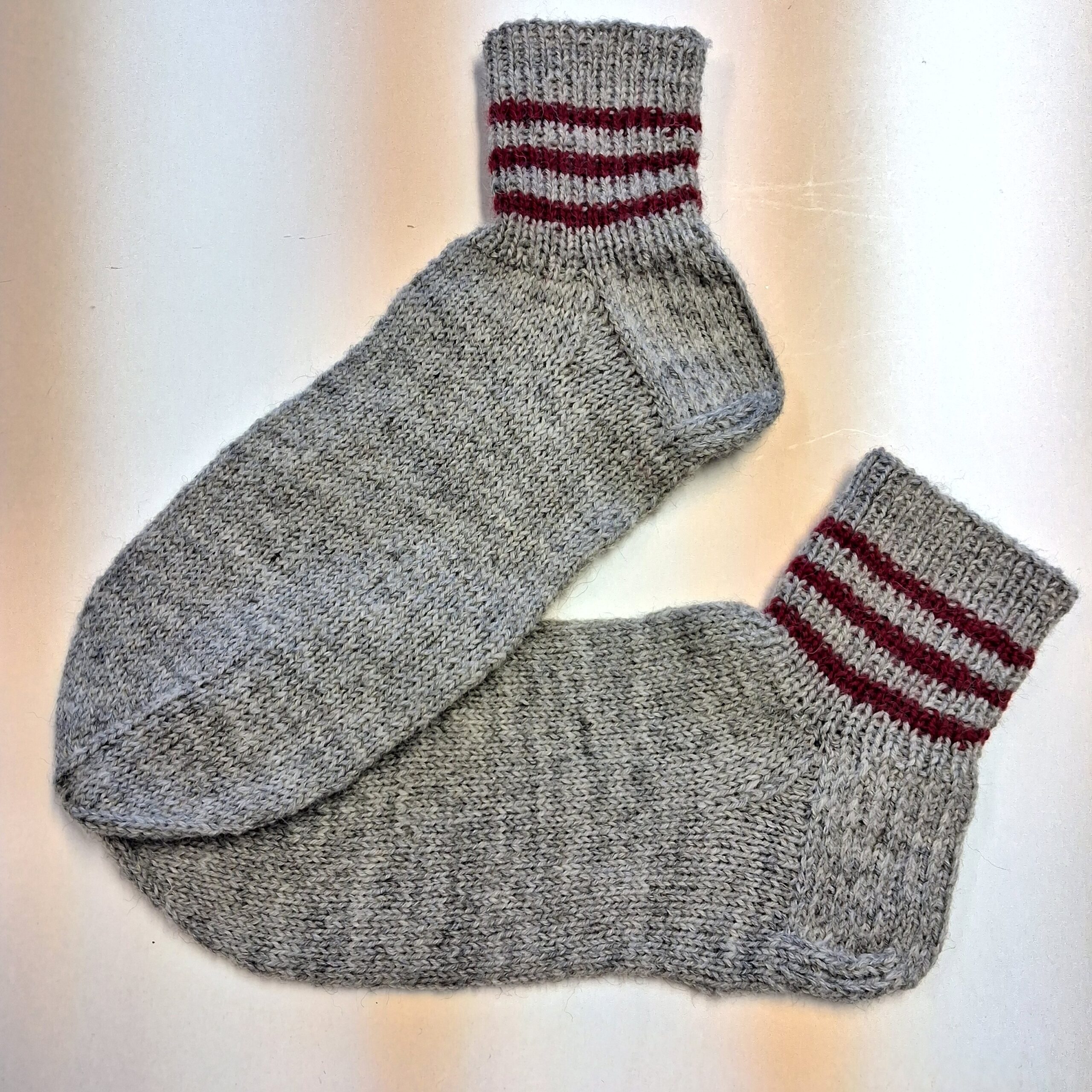 Perusharmaat villasukat, neulottu ohuesta langasta, joten mahtuu kenkiin.