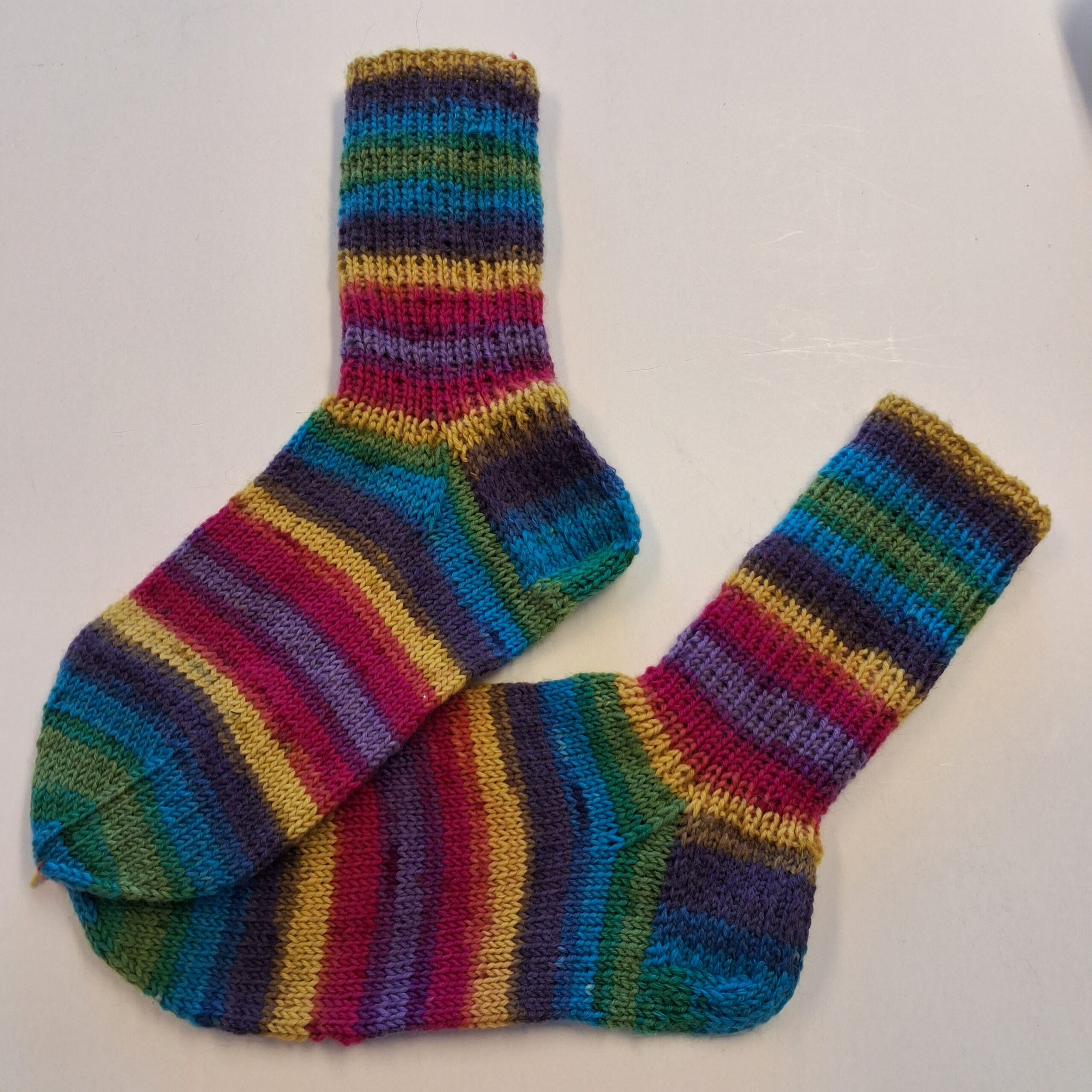 Iloisilla väreillä villasukat, neulottu ohuehkosta langasta, joten mahtuu kenkiin.