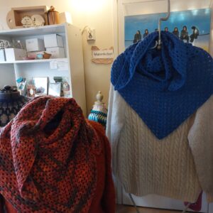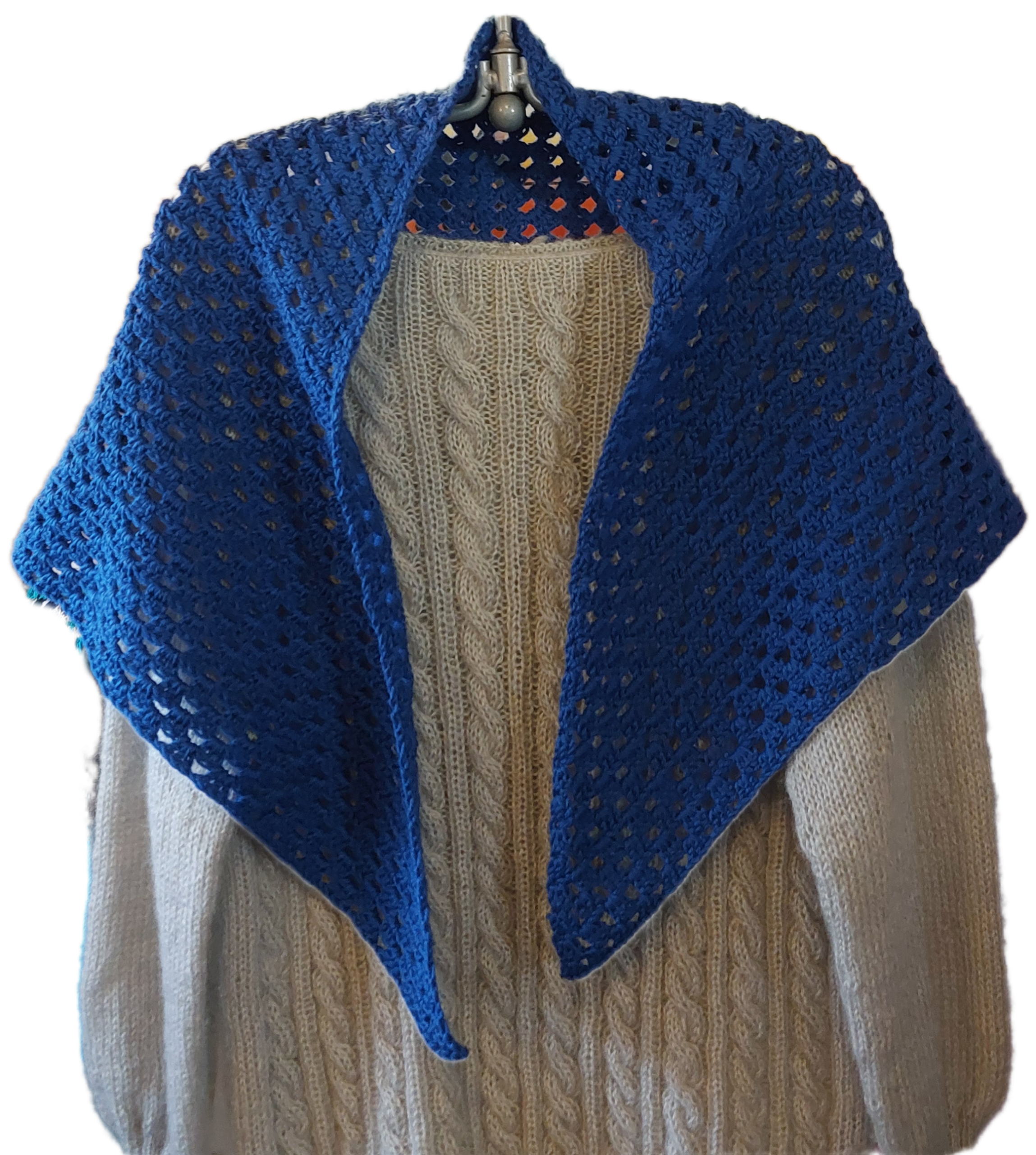 Käsin virkattu kolmiohuivi.